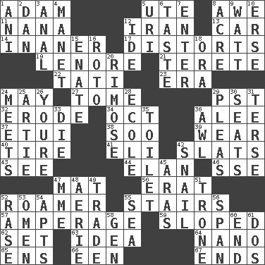 ACROSS 1. First of billions? 5. Shoshoni 8. Deep reverence 11. Grandmother 12. SW Asia republic 13. Auto 14. Sillier 17. What propaganda does 19. Poe poem 21. Cigar-shaped 22. Jacques of French films 23. Period 24. Fifth month 27. Heavy book 29. Pacific Standard Time (abbr.) 32. Wear away 34. Sep. follower 36. Toward shelter 37. Needle case 38. "Barney Miller" actor Jack 39. Erode 40. Hoop that covers a wheel 41. Connecticut Ivy Leaguer 42. Narrow boards 43. Perceive with the eye 44. Liveliness 46. Compass dir. 47. Floor protector 50. Part of Q.E.F. 52. Nomad 55. Flight of steps 57. Electrical Measurement 59. Had an oblique or slanted direction 62. Put into a specified state 63. It may be bright or harebrained 64. Billionth: prefix 65. Followers of ems 66. Car or cant ending 67. Extremities DOWN 1. Cuckoo 2. One of the 12 tribes of Israel 3. Of or related to the anus 4. French painter Edouard 5. RI univ. 6. Clothes sense 7. Keyboard key 8. 43,560 square feet 9. Electrical Unit 10. Celtic language 12. Binary compound 15. Related on the mother's side 16. Printing process, for short 18. Mouth or opening 20. Full of chinks, cracks, or crevices 24. Confronts 25. Nick name for Arthur 26. You are 28. Learning spot: Fr. 29. Entreaties 30. Theater features 31. Laconic 33. Expire 35. Rest room 36. Leather borer 42. Slow-paced one 45. Ancient river in northeast Turkey 47. Madame (abbr.) 48. Nest on high 49. Exchange 51. Marketplace scale 52. Raze (variant) 53. Sign of something about to happen 54. Flats, for short 55. Ocean 56. Connect, as a bridge 58. Commissioned mil. rank 60. Conclude 61. Two (Sp.)