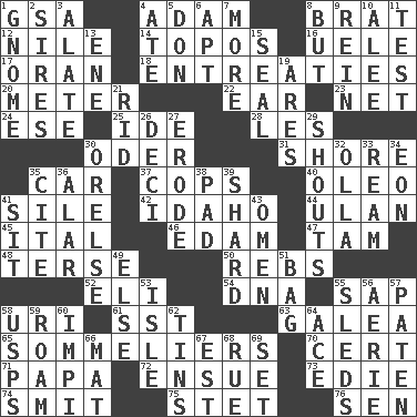 ACROSS 1. Girls' org. (abbr.) 4. First of billions? 8. Naughty child 12. "Death on the ____" 14. Literary convention 16. Ubangi River tributary 17. NW Algerian seaport 18. Pleas 20. Distance measurement 22. Hearing organ 23. Fish or hair follower 24. Compass dir. 25. Binary compound 28. French article 30. River in Europe 31. Dinah or Pauly 35. Automobile 37. 911 reaches them 40. Margarine 41. Drop; flow; fall 42. Potato state 44. Uhlan (variant) 45. Slanted text style (abbr.) 46. Dutch treat 47. Scottish cap 48. Laconic 50. Confederate soldiers (slang) 52. Biblical high priest 54. Heredity factor (abbr.) 55. Plant excrement 58. RI univ. 61. Fast jet (abbr.) 63. An organ shaped like a helmet 65. Wine waiters 70. Sure thing 71. Dad 72. Take place subsequently 73. Singer Brickell 74. Stricken, poetically 75. Proofreading order 76. Elected rep. DOWN 1. Dwarf 2. Male parents of animals 3. Having winglike extensions 4. Had dinner 5. Spanish title 6. Fitting 7. Greater amount 8. With the exception that 9. It's straight from the horse's mouth 10. Toward shelter 11. Trial 13. Compass dir. 15. Lick closed 19. Ancient Greek god of war 21. To free from 26. Tenth: prefix 27. Eat (away) 29. Yells 30. Threatening words 32. Rounded earthenware pot or jar 33. 480, 500 or 516 sheets of paper 34. A really long time 35. Quote 36. Having or resembling wings 38. Groovy apt. 39. Broken piece 41. Be seated 43. Presage 49. Otherwise 51. Paper or plastic container 53. Capri or Wright 55. Bobsleighs 56. Nest on high 57. Eucharist need 58. United States Postal Service (abbr.) 59. Wander 60. Body of Kaffir warriors 62. Airtight sealed metal containers 64. Adept person 66. Floor protector 67. Eastern Standard Time (abbr.) 68. Regret 69. Put into a specified state