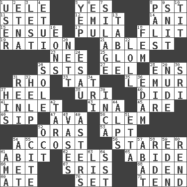 ACROSS 1. Ubangi River tributary 5. Consenting reply 8. Pacific Standard Time (abbr.) 11. Proofreading order 12. Send forth 14. Black tropical American cuckoo 15. Follow as a consequence or result 17. Monetary unit of Botswana 18. Sudden quick movement 19. Food allowance for one day 21. Most capable 23. Born 25. Seize upon or latch onto something 26. Fast planes 27. Snakelike fish 28. Followers of ems 31. 17th letter of the Greek alphabet 33. Make lace 35. Arboreal primate 37. Person who is morally reprehensible 38. RI univ. 40. "You Light Up My Life" star Conn 41. An arm off of a larger body of water 43. _ tizzy (2 wds.) 45. "We ___ not amused" (Victoria) 46. Small drink 47. Actress Gardner 50. Clement's nick name 52. Mouths or openings 53. Fitting 54. Buttonhole 56. A viewer who gazes fixedly 61. "This won't hurt ____!" 62. Snakelike fish 65. Remain 66. Was introduced to 67. Indian titles of respect 68. Arabian gulf 69. Had dinner 70. Put into a specified state 71. Look after DOWN 1. One who uses or employs something 2. Inactive volcano in Sicily 3. For fear that 4. Needle case 5. Slangy assent 6. Australian flightless bird 7. Fodder prepared in a silo 8. Friends 9. In a ____ (agitated or irritated) 10. Teat (slang) 13. Eating place 16. Immeasurably long periods of time 18. Opposite of masc. 20. Remaining after all deductions 22. Hang loosely or laxly 24. Son of Isaac 26. Not divided or shared with others 28. Independent ruler or chieftain 29. Unadorned 30. Indian title of respect (Mr.) 31. Painter Guido (1575-1642) 32. Aid 34. Three (prefix) 36. Dutch treat 37. Part of HMS, perhaps 39. South American Indian 42. Edible starchy tuberous root 44. High mountains 48. Flower holders 49. Michaelmas daisies 51. Singer James 52. Sep. follower 54. Collude with 55. Quote 57. Blind as ____ 58. Travel on or in a vehicle 59. Genesis locale 60. Tear apart 61. Nanny (var.) 63. Falsehood 64. Fast jet (abbr.)