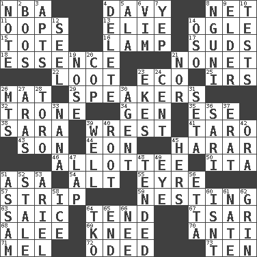 ACROSS 1. Basketball assoc. 4. _ Jones' Locker 8. Fish or hair follower 11. I made a mistake 13. Writer Wiesel 14. Stare 15. Lug 16. Desk light 17. Soap bubbles 18. Center 21. Music written for nine 22. Plunder 23. Environmental prefix 25. Big collection agency 26. Floor covering 29. Orators 32. Marketplace scale 34. Commissioned military rank (abbr.) 35. Compass dir. 38. "Two Mules for Sister ____" 39. Take or capture by force 41. Edible starchy tuberous root 43. Male offspring 44. Period of immesurable duration 45. Ethiopian city, capital of Harari 46. One to whom something is allotted 50. Call ___ day 51. White ___ sheet 54. Keyboard modifier key 55. Jane of fiction 57. Remove all contents or possession from 59. Inhabiting a nest 63. Ketch in the Levant 64. Watch over 67. Russian ruler of old 68. Toward shelter 69. Leg joint 70. Against 71. Cartoonist voice _ Blanc 72. Wrote a lyric poem 73. Nine, plus one DOWN 1. Make mention of 2. Expressions of contempt or scorn 3. Tenement units (abbr.) 4. Erase 5. Insect wing 6. Zeal 7. Slangy assent 8. Group of southern Bantu languages 9. A person who is older than you are 10. Trials 12. Sew up the eyelids of hawks and falcons 14. Bear (Spanish) 19. Characteristic smell of wine 20. Police officer (slang) 21. And not 23. Supplements with great effort 24. Penny 26. Mountains (abbr.) 27. Ancient river in northeast Turkey 28. "Corrida" creature 30. Rep 31. Stalk of a moss capsule 33. Grandmother 36. Indian skirt 37. Part of Q.E.F. 39. Water source 40. Carrot, for example 42. Mouth or opening 45. Possessive pronoun 47. Pet locale 48. Watched over 49. Sight organ 51. Indian state 52. Lacking originality or spontaneity 53. Satellite of Uranus 56. Singer James 58. Frozen water 60. Is not 61. Nathan's nickname 62. Broad smile 64. Ring climax 65. Conclusion 66. Born