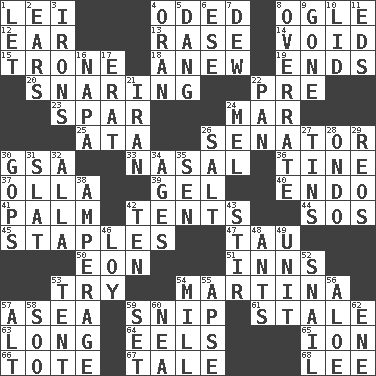 ACROSS 1. Luau accessory 4. Wrote a lyric poem 8. Stare 12. Hearing organ 13. Raze (variant) 14. Nothingness 15. Marketplace scale 18. Afresh 19. Extremities 20. Catching in a trap 22. Before (prefix) 23. Coast Guard woman 24. Third mo. 25. _ moment's notice (2 wds.) 26. Elected representative 30. Girls' org. (abbr.) 33. Rhinal 36. Prong on a fork 37. Spanish pot 39. Set 40. Inside; within (prefix) 41. Inside of hand 42. Portable shelters 44. Mayday 45. Paper fasteners 47. The 19th letter of the Greek alphabet 50. A really long time 51. Taverns 53. Attempt 54. Chrissie's court nemesis 57. Toward the sea 59. Sever or remove by pinching or nipping 61. Having lost freshness 63. Protracted 64. Snakelike fish 65. Electrically charged atom 66. Haul 67. Story 68. Area sheltered from the wind DOWN 1. Allow 2. Hearing organs 3. Metal shackles 4. NW Algerian seaport 5. Mild oath, euphamism for damn 6. Compass dir. 7. Morning condensation 8. Make much ado about nothing 9. Went 10. Flaplike covering 11. Begley and Asner 16. California wine valley 17. Part of Q.E.F. 21. SW Asia republic 22. Baking dish 24. Cartoonist voice _ Blanc 26. Table seasoning 27. Airtight sealed metal containers 28. Southwest Nigerian state 29. Vintage cars 30. Republicans 31. Narrow board 32. Silent film actress Nazimova 34. Ripens 35. Elected rep. 38. Electrical Measurement 42. "___ Little Indians" 43. Use a spoon 46. Myrna of the movies 48. Pismires 49. A single undivided whole 52. Slow-paced one 53. Portable shelter 54. Place where flour is made 55. Domed church section 56. Medicinal plant 57. Keyboard modifier key 58. "Barney Miller" actor Jack 59. Arrange properly for use 60. Teachers' org. 62. Compass dir.