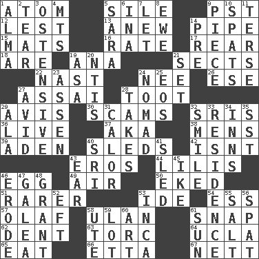 ACROSS 1. Tiny particle 5. Drop; flow; fall 9. Pacific Standard Time (abbr.) 12. For fear that 13. Afresh 14. Corncob 15. Floor protectors 16. Pace 17. Stern 18. "We ___ not amused" (Victoria) 19. Santa ___, CA 21. Religious groups 22. Political cartoonist Thomas 24. Born 26. Compass dir. 27. Slender Brazilian palm 28. A blast of a horn 29. Deliberation 30. Fraudulent business schemes 32. Indian titles of respect 36. Not recorded 37. Alias (abbr.) 38. Not women's 39. Arabian gulf 40. Bobsleighs 42. Is not 43. Greek god of love 44. Ms. Damita and namesakes 46. Oval reproductive body of a fowl 49. Atmosphere 50. Supplemented with great effort 51. More valued for its uncommonness 53. Binary compound 54. Double-curved letter 57. Norwegian king 58. ____ Bator, Mongolia 61. Fastener 62. Gouge 63. Torque (variant) 64. Southern CA. univ. 65. Ingest 66. Singer James 67. Remaining after all deductions DOWN 1. _ mater 2. Pull into pieces 3. Clearly or manifestly demonstrative 4. Mountains (abbr.) 5. "Two Mules for Sister ____" 6. _ tizzy (2 wds.) 7. Allow 8. She-sheep 9. Part 10. Arguments over trivial matters 11. Laconic 14. Before (prefix) 19. White ___ sheet 20. Nuclear Threat Initiatives 21. Arrange properly for use 23. NE Netherlands city 24. Wanderer 25. Greek goddess of the dawn 27. Enthusiastic 28. Proceeds 29. Wing 31. Bodily heat indicating an inflammation 32. Grin 33. Dwelling 34. Lodging establishments 35. Fast jet (abbr.) 40. Indian title of respect (Mr.) 41. Downhill vehicle 43. Ewer handle 45. Mamie's husband 46. Eat (away) 47. An organ shaped like a helmet 48. Monetary aid 52. Bank Draft (abbr.) 53. South American Indian 55. Table seasoning 56. Argument over a trivial matter 58. Shoshoni 59. Car dealer's back yard 60. Nonscientific branch of learning 61. Player for Phoenix
