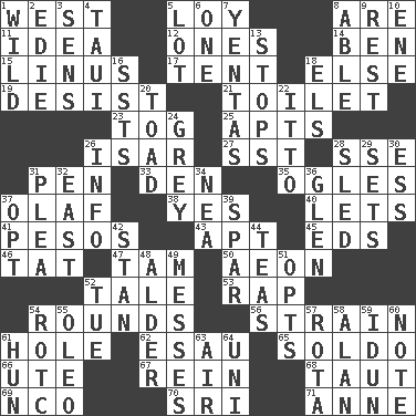 ACROSS 1. Compass direction 5. Myrna of the movies 8. "We ___ not amused" (Victoria) 11. The content of cognition 12. Singles 14. Benjamin's nick name 15. "_ and Lucy" (Charlie Brown theme song) 17. Portable shelter 18. Otherwise 19. Cease 21. Bathroom plumbing fixture 23. Coat; cloak 25. Tenement units (abbr.) 26. Austrian river, tributary to the Danube 27. Fast jet (abbr.) 28. Compass dir. 31. Animal enclosure 33. Lair 35. Stares at amorously 37. Norwegian king 38. Affirmative reply 40. Allows 41. Mexican monetary units 43. Fitting 45. Begley and Asner 46. Make lace 47. Scottish cap 50. A really long time 52. Story 53. Strike 54. Periods in a boxing match 56. Put through a sieve 61. Hollow 62. Son of Isaac 65. Twentieth part of a lira 66. Shoshoni 67. It's straight from the horse's mouth 68. Pulled tight 69. Non-commissioned officer (abbr.) 70. _ Lanka 71. Singer Murray DOWN 1. Uncontrolled 2. Singer Brickell 3. Elected reps. 4. "Change" in Tahitian 5. Car dealer's back yard 6. Single 7. Gossips 8. Competent 9. Respite 10. Compass dir. 13. Obstructs or blocks passage 16. Fast planes 18. Raised railways 20. Frog relative 22. "Tell ____ the Marines!" 24. Jennifer or Joel 26. A message received and understood 28. Downhill vehicle 29. Arranges properly for use 30. Curvy letter 31. Entreaty 32. 90 degrees 34. Teachers' org. 36. Small, secluded valley 37. Elect 39. Practice fight 42. Comedian Laurel of Laurel & Hardy 44. Beverages made from leaves 48. Tree or shrub in the Birch family 49. Makes clutter 51. Chooses 52. Third day of the wk. 54. College mil. group 55. Butter sub 57. Round or rotation of duties 58. Actor Alda or Thicke 59. Goddess of spring and wife of Bragi 60. Observe 61. Attila the _ 63. Atmosphere 64. Single; one (prefix)