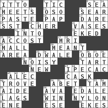 ACROSS 1. "Tell ____ the Marines!" 5. Nervous spasm 8. Ocean 11. Confronts 13. Bear (Spanish) 14. Scorch 15. Thick mixture 16. Infant food 17. Have the gumption 18. Fast jet (abbr.) 19. "Mermaids" star 21. Flower holders 22. To the inside or interior of 24. Made supply last 25. Buttonhole 27. Medical imaging device (abbr.) 29. Promenade 30. Intended 32. Length times width 33. A sleeping potion; an opiate (poet.) 35. Mitch Miller's instrument 39. Annoyingly loud 41. Small pie 42. ___ Haven, CT 43. Medicinal drug used to evoke vomiting 45. Actor Baldwin 48. Keg 49. Collection of objects 50. Collude with 52. Scottish cap 55. Helper 56. Actress Gardner 57. Peak District village in England 59. Straggles 60. Acquire through effort 61. High-strength synthetic material 62. Compass dir. 63. Compass dir. 64. Supplements with great effort DOWN 1. Naughty children 2. Afternoon social gatherings 3. A testis 4. Baseball player Mel 5. Drink excessively 6. Austrian river, tributary to the Danube 7. Police officer (slang) 8. Gospel singer Marvin 9. Having ears or earlike features 10. Ancient Greek god of war 12. Religious groups 14. Neighbor of Neb. 20. Being at a high temperature 21. Distinctive style or manner 23. Pitcher Ryan 25. Nanny (var.) 26. 4-wheeled motor vehicle 27. Cartoonist voice _ Blanc 28. Actress Charlotte 30. Fifth month 31. Hauls 33. Expire 34. Compass dir. 36. Sass 37. Mouth or opening 38. And so on (abbr.) 40. Single time 43. Frozen water 44. Eucharist need 45. Believer in; advocate of (suffix) 46. Inn 47. Nights before holidays 49. Falsehood 50. Advice 51. Object of repulsion 53. _ vera 54. Not women's 56. Deep reverence 58. Color
