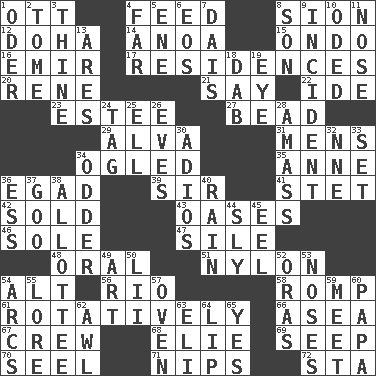 ACROSS 1. Baseball player Mel 4. Nourish 8. The Jewish people; Israel 12. Capital of the state of Qatar 14. Small Philippine buffalo 15. Southwest Nigerian state 16. Arab leader 17. Dwellings 20. French philosopher Descartes 21. Declare 22. Binary compound 23. First name in cosmetics 27. Necklace unit 29. Inventor's middle name 31. Not women's 34. Stared at amorously 35. Singer Murray 36. Mild oath 39. Title for a knight 41. Proofreading order 42. Disposed of to a purchaser 43. Fertile tracts in a desert 46. Not divided or shared with others 47. Drop; flow; fall 48. Relating to the mouth 51. High-strength synthetic material 54. The first octave above the treble staff 56. River (Sp.) 58. Play 61. Producing rotation 66. At sea 67. Ship's personnel 68. Writer Wiesel 69. Ooze 70. Stitch closed the eyes of (a falcon) 71. Pinches, bites 72. R.R. building DOWN 1. River in Europe 2. Heavy book 3. One or ones belonging to thee 4. At a great distance 5. Compass dir. 6. Greek goddess of the dawn 7. Raised platform 8. Manchild 9. Happening 10. Wrote a lyric poem 11. Sense of smell 13. Ancient Greek god of war 18. Pat or tap gently 19. Sight organ 24. Label 25. Pipe bend 26. Nights before holidays 28. Collect or gather 30. Goodbye (Sp.) 32. Compass dir. 33. Arrange properly for use 34. More peculiar 36. Double-curved letter 37. Thick or sticky substance 38. One to whom something is allotted 40. Precipitation 44. Roguish 45. Snakelike fish 49. Tate display 50. Cards in a Roman deck? 52. Mouths or openings 53. Olfactory organs 54. Curves 55. Old wives' tales, e.g. 57. Baking chamber 59. Rendezvous 60. Dad 62. Leather borer 63. Biblical high priest 64. Mouth edge 65. It is so