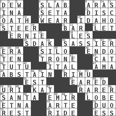 ACROSS 1. Morning condensation 4. Broad, flat, thick piece 8. Caspian sea tributary 12. _ tizzy (2 wds.) 13. Bristle 14. Plate 15. Pledge 17. Put on (as clothing) 18. Potato state 19. Bull 21. Oblong piece of solid material 23. Allow 24. Bert's buddy 26. French article 28. Neighbor of Neb. 30. More lively and spirited 34. Epoch 37. Grain storage tower 39. Inside; within (prefix) 40. "___ Little Indians" 41. Heavy duty weighing machine 43. Feline 44. Ballerina skirt 46. Slanted text style (abbr.) 47. Nursemaid (var.) 48. Refrain by choice 51. Tall New Zealand timber tree 54. Eastern Standard Time (abbr.) 55. Having ears or earlike features 58. RI univ. 61. Krazy ___ of comics 63. More valued for its uncommonness 65. Before Barbara or Clara 67. Independent ruler or chieftain 71. Ear part 72. Inactive volcano in Sicily 73. Johnson of "Laugh-In" 74. Superhero pair 75. State of inaction 76. Travel on an animal 77. Curvy letter DOWN 1. "Vaya con ____" 2. Related on the mother's side 3. Wetness 4. Compass dir. 5. Area sheltered from the wind 6. "One Day ___ Time" 7. Sharp remark 8. Say or write further 9. Monetary unit of Yemen 10. American tennis player Robert 11. Highlander 16. Coop moms 18. Angers 20. To free from 22. Chicken ___ king 25. 90 degrees 27. Compass dir. 29. Japanese brewing company 30. Echolocation 31. South American Indian 32. Dutch treat 33. Round or rotation of duties 34. Singer James 35. Reuben's nickname 36. Pismires 38. Car dealer's back yard 42. Writer Wiesel 45. Shoshoni 49. "____ silly question..." 50. Call ___ day 52. Make imperfect 53. Mountain range 56. Wear away 57. Alight from a bus 58. One who makes use of a thing 59. Assign a rank or rating to 60. Restaurants 62. Pull apart 64. Vintage cars 66. Make lace 68. Medical imaging device (abbr.) 69. It would 70. To separate or throw off
