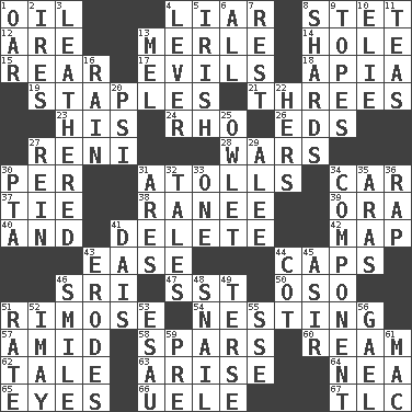 ACROSS 1. Petroleum 4. One who doesn't tell the truth 8. Proofreading order 12. "We ___ not amused" (Victoria) 13. Haggard of country music 14. Hollow 15. Posterior 17. Vices 18. Capital of Western Samoa 19. Paper fasteners 21. Triplets 23. Part of HMS, perhaps 24. 17th letter of the Greek alphabet 26. Begley and Asner 27. Painter Guido (1575-1642) 28. Armed conflicts 30. For each 31. Ringlike coral islands and reefs 34. Automobile 37. Make a knot 38. Indian princess (variant) 39. Mouth or opening 40. Added to 41. Erase 42. Atlas unit 43. Relaxation 44. Balmoral and tarboosh 46. _ Lanka 47. Fast jet (abbr.) 50. Bear (Spanish) 51. Full of chinks, cracks, or crevices 54. Snuggling 57. Among 58. Practice fights 60. 480, 500 or 516 sheets of paper 62. Falsehood 63. Get up 64. Teachers' org. 65. Sight organs 66. Ubangi River tributary 67. Affectionate concern, for short DOWN 1. Boat paddle 2. Angers 3. Tough but pliablecoriaceous 4. Crowbar 5. From or relating to Ireland 6. Everything 7. Take ten 8. Pottery fragments 9. Drinks excessively 10. Writer Wiesel 11. Beverages made from leaves 13. Cartoonist voice _ Blanc 16. Water falling in drops from the sky 20. Air pressure measure (abbr.) 22. Possessive pronoun 25. A small or young owl 27. It's straight from the horse's mouth 29. Toward shelter 30. Parent Teacher Association (abbr.) 31. Ancient Greek god of war 32. Falsehoods 33. Single 34. Piece 35. Caspian sea tributary 36. Strike 41. Raised platform 43. Eats (away) 44. Small bed 45. SW Saudi Arabia district 46. Grin 48. Slow-paced one 49. Laconic 51. Assign a rank or rating to 52. "If ____ say so..." 53. He sold his birthright 55. Compass dir. 56. Highlander 59. Before (prefix) 61. Big _