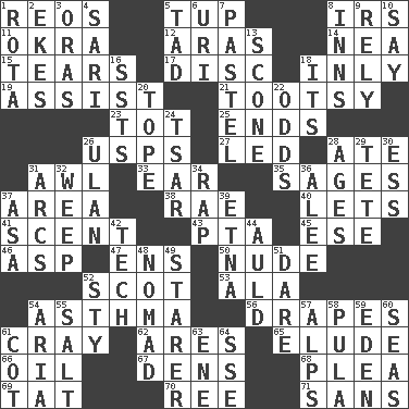 ACROSS 1. Vintage cars 5. Uncastrated adult male sheep 8. Big collection agency 11. Gumbo ingredient 12. Ancient river in northeast Turkey 14. Teachers' org. 15. Rends 17. Compact _ 18. In an inward manner 19. Aid 21. Tootsie (variant) 23. Small child 25. Extremities 26. United States Postal Service (abbr.) 27. Directed 28. Had dinner 31. Leather borer 33. Ewer handle 35. Gurus 37. Type of rug 38. Actress Charlotte 40. Allows 41. Odor 43. Parent Teacher Assoc. 45. Compass dir. 46. Cleo's killer 47. Followers of ems 50. Unadorned 52. Highlander 53. Wing 54. Respiratory problem 56. Window treatments 61. Supercomputer manufacturer 62. Ancient Greek god of war 65. Evade 66. Lubricate 67. Hiding places for outlaws 68. Entreaty 69. Make lace 70. To sift 71. Without DOWN 1. Round or rotation of duties 2. Supplements with great effort 3. Mouths or openings 4. Indian skirt 5. Bit 6. RI univ. 7. Soft color 8. Lodging establishments 9. Depend 10. Declare 13. Biscuitlike quick bread 16. Fast planes 18. ___ a Wonderful Life 20. Drink excessively 22. Likelihood 24. Russian ruler of old 26. ____ Bator 28. Matures 29. False hair 30. Double-curved letter 31. Arches 32. Shed a tear 34. Reproach for some lapse or misdeed 36. Toward shelter 37. White ___ sheet 39. Inactive volcano in Sicily 42. Technology 44. Old (Scot.) 48. Roamer 49. A viewer who gazes fixedly 51. Have the gumption 52. Filthy place 54. Operatic vocal solo 55. Table seasoning 57. High mountains 58. Monetary unit of Botswana 59. Genesis locale 60. Oceans 61. Small bed 63. Compass dir. 64. Compass dir.