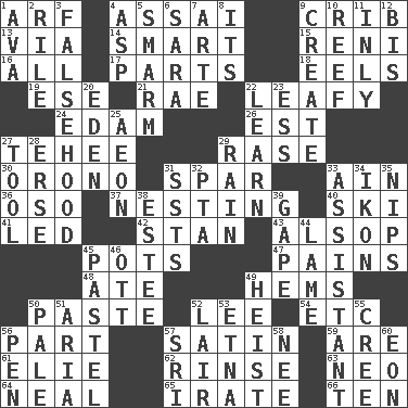 ACROSS 1. Sandy's bark 4. Slender Brazilian palm 9. Baby bed with high sides 13. By way of 14. Don Adams' spy role 15. Painter Guido (1575-1642) 16. 100% 17. Components 18. Snakelike fish 19. Compass dir. 21. Actress Charlotte 22. Like summer trees 24. Dutch treat 26. Eastern Standard Time (abbr.) 27. Giggle 29. Raze (variant) 30. U. of Maine site 31. Practice fight 33. The 18th letter of the Arabic alphabet 36. Bear (Spanish) 37. Nestling 40. What Jean-Claude Killy likes to do 41. Directed 42. Comedian Laurel of Laurel & Hardy 43. Columnist Joseph or Stewart 45. Cooking vessels 47. Aches 48. Had dinner 49. Is hesitant and indecisive 50. Thick mixture 52. Area sheltered from the wind 54. And so on (abbr.) 56. Component 57. Smooth fabric 59. "We ___ not amused" (Victoria) 61. Writer Wiesel 62. Remove soap 63. Modern: prefix 64. Actress Patricia 65. Feeling or showing extreme anger 66. "___ Little Indians" DOWN 1. Actress Gardner 2. Cause heat under the collar 3. It jiggles the polygraph 4. Cleo's killer 5. Excessive but superficial compliments 6. "Two Mules for Sister ____" 7. Johnson of "Laugh-In" 8. It is 9. Make 10. Coral ridge 11. In an inward manner 12. Twice 20. Locale of original sin 22. Acquire or gain knowledge or skills 23. Curvy letter 25. Age 27. Utensil 28. Celtic language 29. Precipitation 31. Fast planes 32. Parent Teacher Association (abbr.) 33. Aide 34. Picture 35. Pinches, bites 38. First name in cosmetics 39. Yawn 44. Unable to walk 45. Soft color 46. Baseball player Mel 49. Robbery 50. Light colored 51. Roberta Peters solo 52. Den 53. Inactive volcano in Sicily 55. Algonquian 56. Fenced enclosure 57. Indian title of respect (Mr.) 58. Born 60. Period of immesurable duration