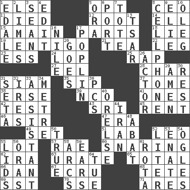 ACROSS 1. Otherwise 5. Choose 8. Corporate head (abbr.) 11. Passed on 12. Carrot, for example 14. Pipe bend 15. At full speed 17. Actors' quests 18. Whopper 19. Small, flat, pigmented spot on the skin 21. Afternoon social gathering 22. Part of a journey 23. Curvy letter 24. Trim (branches) 25. Hit sharply and swiftly 27. Snakelike fish 28. Burn to charcoal 31. Thailand, formerly 35. Small drink 37. Heavy book 38. Celtic language 39. Non-commissioned officer (abbr.) 41. Singles 42. Trial 43. _ Lanka 45. Monthly bill 46. SW Saudi Arabia district 47. Epoch 49. Arrange properly for use 51. Experiment locale 52. Lion 55. Car dealer's back yard 57. Actress Charlotte 60. Catching in a trap 62. Lyricist Gershwin 63. A salt of uric acid 65. Add up to 66. One of the 12 tribes of Israel 67. Shade of tan 68. False hair 69. Fast jet (abbr.) 70. Compass dir. 71. Ancient Greek god of war DOWN 1. Peak District village in England 2. Citrus fruits 3. Seines 4. Prepare for publication 5. Mouth or opening 6. Sweet dark-red dessert wine 7. Carryall 8. Portable communications device 9. Writer Wiesel 10. Cassini of fashion 13. Russian ruler of old 16. The longest river in the world 17. Cotton for raincoats, e.g. 20. Moves 26. Thespian 29. So be it 30. State of inaction 31. Bristle 32. Angers 33. Aide 34. Distance measurement (Brit.) 36. Personal Computers (abbr.) 40. Threatening words 44. SW Asia republic 48. Blind as ____ 50. Loyal 52. 61 cubic inches 53. Related on the mother's side 54. Stares at amorously 55. Hats (slang) 56. Mouths or openings 58. Curves 59. Hearing organs 61. Roll call or roster of names 64. Third day of the wk.