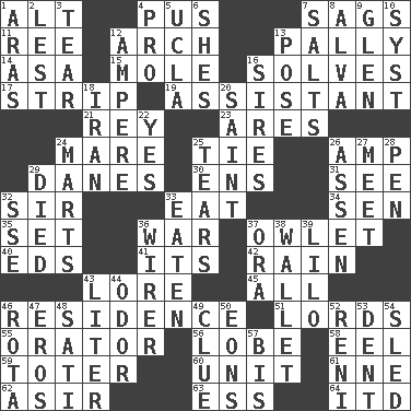 ACROSS 1. The first octave above the treble staff 4. Fluid product of inflammation 7. Settles 11. To separate or throw off 12. Bowlike part 13. Friendly 14. White ___ sheet 15. Undercover agent 16. Finds the solution 17. Empty completely 19. Helper 21. Marina Del _, California 23. Ancient Greek god of war 24. Female horse 25. Standoff 26. Electrical Unit 29. Natives or inhabitants of Denmark 30. Followers of ems 31. Perceive with the eye 32. Title for a knight 33. Consume 34. Elected rep. 35. Arrange properly for use 36. Armed conflict 37. A small or young owl 40. Begley and Asner 41. It is 42. Precipitation 43. Old wives' tales, e.g. 45. 100% 46. Dwelling 51. Titled peers of a realm 55. Speaker 56. Ear part 58. Snakelike fish 59. Carrier 60. A single undivided whole 61. Compass dir. 62. SW Saudi Arabia district 63. Double-curved letter 64. It would DOWN 1. Caspian sea tributary 2. For fear that 3. Separate forcefully 4. Adept person 5. Southern CA. univ. 6. "______ My Girl" (Turtles hit) 7. Table seasonings 8. Inventor's middle name 9. Small, secluded valley 10. System (abbr.) 12. Electrical Unit 13. Introduce or present, as a question 16. Begets 18. SW Asia republic 20. Inhabitant of Heaven 22. It is so 24. Shops 25. Separates forcefully 26. NE Netherlands city 27. Rendezvous 28. Fenced enclosure 29. Passed on 32. Compass dir. 33. Ingested 36. One who wires 37. Mouth or opening 38. Place for singles 39. _ and Stitch 43. 61 cubic inches 44. Aroma 46. Round or rotation of duties 47. Greek god of love 48. Suttee (variant) 49. A slight indication 50. Immeasurably long periods of time 52. Painter Guido (1575-1642) 53. Scratch 54. Downhill vehicle 57. Twice