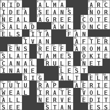 ACROSS 1. To free from 4. _ mater 8. Curve 11. The main thing one is thinking about 13. Seines 15. And not 16. Actress Patricia 17. Match 18. ____ d'Azur (French Riviera) 19. Vegetable dish 21. Leather borer 22. Single time 23. Raised railways 24. Call ___ day 27. Avid follower 29. _ the terrible 30. Following 34. Followers of ems 36. Coral collection 39. Odor 40. Narrow board 41. Corrects by punishment or discipline 43. Migrant worker of the '30s 44. Lessep's creation 46. Governing power 47. Fish or hair follower 48. Silly 49. For fear that 51. Of large size 53. The first octave above the treble staff 54. Shade tree 57. Ballerina skirt 60. Reproach for some lapse or misdeed 63. Nest on high 65. Welt 66. Feeling or showing extreme anger 69. Grand slam 70. 100% 71. Effrontery 72. Prepare for publication 73. Perceive with the eye 74. Comedian Laurel of Laurel & Hardy 75. Double-curved letter DOWN 1. Remove soap 2. Perfect 3. Allots cards 4. White ___ sheet 5. Part of a journey 6. Hindu Mythology: god of death 7. Afresh 8. At once, immediately (arch.) 9. College mil. group 10. Algonquian 12. According to 14. Automatic 18. Meet 20. HTML Container Element 25. Small pie 26. Approach 28. American Automobile Association (abbr.) 29. Byzantium, centuries later 31. Puff or smoke 32. Send forth 33. Actress Charlotte 34. Flair 35. Nanny 37. Australian flightless bird 38. Man or boy (slang) 40. _-fi 42. Sew up the eyelids of hawks and falcons 45. Flowery wreath 50. R.R. building 52. Broad smile 54. Eat (away) 55. Ms. Damita and namesakes 56. Confronts 57. It was, poetically 58. Ubangi River tributary 59. Falsehood 61. Ancient Greek god of war 62. Role in a play 64. First lady 67. Federal power corp. 68. Car or cant ending