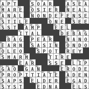 ACROSS 1. Fitting 4. Fly high 8. Toward the sea 12. Female horse 14. Flexible twig of a willow tree 16. Be tempered by heat 17. Of or related to the anus 18. Unrelated to defense, as in spending 20. Vertical member of a panel or frame 22. Single 23. Observe 24. Fast jet (abbr.) 25. Electrical Unit 28. Snakelike fish 30. Slanted text style (abbr.) 31. Debunk (Brit. slang) 35. Paper or plastic container 37. Lightbulb-shaped fruit 40. Billionth: prefix 41. Merit 42. Indian antelope 44. Southwest Nigerian state 45. Margarine 46. Specific locale 47. Marina Del _, California 48. Excessive but superficial compliments 50. Become fatigued 52. Hearing organ 54. Compass dir. 55. Mouth edge 58. E Mali city 61. Separate the seeds from cotton 63. Eat (away) 65. Appease 70. Arabian gulf 71. Plant excrements 72. A person who is older than you are 73. Mild oath 74. System (abbr.) 75. Pulitzer Prize-winning author Ferber 76. Raised railways DOWN 1. Collect or gather 2. Leg coverings 3. Distinguishing feature 4. Male offspring 5. Bear (Spanish) 6. The 18th letter of the Arabic alphabet 7. Redecorate 8. A saturated hydrocarbon 9. Elected reps. 10. Relaxation 11. Toward shelter 13. Pipe bend 15. French philosopher Descartes 19. Nourish 21. Ingest 26. Atlas contents 27. Entreaties 29. Poe poem 30. Fail to notice 32. Object of repulsion 33. Actor Griffith 34. Thick or sticky substance 35. Lip ointment 36. Type of rug 38. Viper 39. Debaucheries 41. Greek goddess of the dawn 43. Nuclear Threat Initiatives 49. Wise men 51. Portuguese money of account (variant) 53. Assign a rank or rating to 55. Inn 56. Standard of perfection 57. Hangs 58. Global Positioning Systems (abbr.) 59. Like ___ of sunshine 60. I made a mistake 62. The longest river in the world 64. Actress Charlotte 66. Pacific Standard Time (abbr.) 67. Find the sum of 68. "___ Little Indians" 69. Period