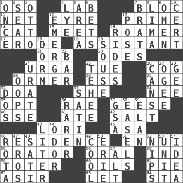 ACROSS 1. Bear (Spanish) 4. Experiment locale 7. Alliance 11. Fish or hair follower 12. Jane of fiction 13. First class 14. Domesticated feline 15. Confront 16. Nomad 17. Wear away 19. Helper 21. Globe 23. Lyric poems 24. Capital and largest city of Mongolia 25. Third day of the wk. 26. Gear tooth 29. Channel Islands abalone 30. Double-curved letter 31. Grow older 32. ___ good deed 33. A female animal or person 34. Born 35. Elect 36. Actress Charlotte 37. Honkers 40. Compass dir. 41. Had dinner 42. Table seasoning 43. Australian parrot (variant) 45. White ___ sheet 46. Dwelling 51. World-weariness 55. Speaker 56. Taken by mouth 58. Working for oneself (abbr.) 59. Carrier 60. Lubricates 61. Sliced dessert 62. SW Saudi Arabia district 63. Allow 64. R.R. building DOWN 1. At one time in the past 2. Shrivel 3. "Beetle Bailey" pooch 4. Sodium hydroxide 5. Length times width 6. Wagers 7. Naughty children 8. Pale green bean 9. Presage 10. Foregone conclusion 12. Develop 13. Introduce or present, as a question 16. Amusement-park features 18. Dormintory (informal) 20. Lush 22. Oblong piece of solid material 24. A salt of uric acid 25. Giggle 26. 2nd pers. sing. pres. of can (arch.) 27. Double curve, resembling the letter S 28. Unit of force equal to gravity 29. I made a mistake 32. Two (Sp.) 33. Smooth fabric 36. More valued for its uncommonness 37. Girls' org. (abbr.) 38. Artist's stands 39. Liveliness 43. 61 cubic inches 44. Aroma 46. Round or rotation of duties 47. Greek god of love 48. Suttee (variant) 49. Calm and collected 50. One of the Great Lakes 52. Pinches, bites 53. A single undivided whole 54. The main thing one is thinking about 57. Keyboard modifier key