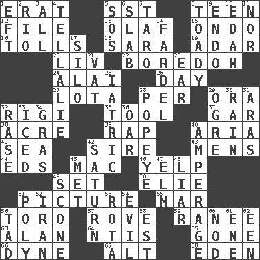 ACROSS 1. Part of Q.E.F. 5. Fast jet (abbr.) 8. Adolescent 12. Do some clerical work 13. Norwegian king 15. Southwest Nigerian state 16. For Whom the Bell _____ 18. "Two Mules for Sister ____" 19. The sixth month of the Jewish calendar 20. 54 in ancient Rome 22. Mood resulting from idleness 24. Jai ____ 26. 24 hours 27. Globular water bottle used in Asia 28. For each 29. Mouth or opening 32. Swiss mountan, "Queen of the Mountains" 35. Utensil 37. Slender fish 38. 43,560 square feet 39. Reproach for some lapse or misdeed 40. Roberta Peters solo 41. Ocean 42. Father 43. Not women's 44. Begley and Asner 45. Big _ 46. Sharp bark 49. Put into a specified state 50. Writer Wiesel 51. Photo 55. Make imperfect 56. "Corrida" creature 57. Be footloose 59. The wife of a rajah (variant) 63. Actor Alda or Thicke 64. Nuclear Threat Initiatives 65. Went 66. Unit of force 67. Keyboard modifier key 68. Genesis locale DOWN 1. Lizard (obsolete) 2. River (Sp.) 3. 100% 4. Copy Pinocchio 5. Mayday 6. Broad, flat, thick piece 7. Edible starchy tuberous root 8. Sycophant 9. Inside; within (prefix) 10. Dutch treat 11. Not either 14. Pack 17. Grain storage tower 21. Large container 23. Ewer handle 25. Of or pertaining to medicine 28. Wimpy's pal 29. Legendary monster 30. Precipitation 31. Ancient river in northeast Turkey 32. To erase 33. On the rocks 34. Pate de foie ____ 36. Boat paddle 40. Electrical Measurement 42. Titan orbits this 45. Was introduced to 47. Shade tree 48. One who doesn't tell the truth 49. Biscuitlike quick bread 51. Many (prefix) 52. SW Asia republic 53. Round or rotation of duties 54. Morally bad or wrong 56. Small amount or degree 58. Eastern Standard Time (abbr.) 60. Dreamland 61. Compass dir. 62. Car or cant ending