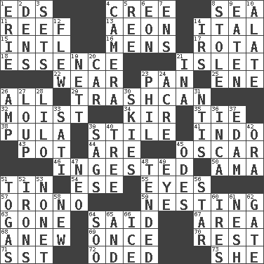 ACROSS 1. Begley and Asner 4. Algonquian 8. Ocean 11. Coral collection 13. Period of immesurable duration 14. Slanted text style (abbr.) 15. International (abbr.) 16. Not women's 17. Roll call or roster of names 18. Gist 21. Small island 22. Put on (as clothing) 23. Baking dish 25. Compass dir. 26. 100% 29. File 13 32. Damp 34. Apertif with cassis 35. Make a knot 38. Monetary unit of Botswana 39. Vertical member of a panel or frame 41. Southeast Asian peninsula 43. Cooking vessel 44. "We ___ not amused" (Victoria) 45. Witty Wilde 46. Consumed 50. Wet nurse (var.) 51. Shallow baking pan 54. Compass dir. 55. Snake ____ (dice throw) 57. U. of Maine site 59. Inhabiting a nest 63. Went 64. Stated 67. Type of rug 68. Afresh 69. Single time 70. Remainder 71. Fast jet (abbr.) 72. Wrote a lyric poem 73. A female animal or person DOWN 1. 4th largest of the Great Lakes 2. Habitations of wild animals 3. Arranges properly for use 4. Device for capturing images 5. To sift 6. Period of immesurable duration 7. Followers of ems 8. Took without asking 9. Ingested 10. Having winglike extensions 12. Soared 14. Big collection agency 19. Remaining after all deductions 20. Auto 21. _ tizzy (2 wds.) 23. Silvers or Donahue 24. Land measure 26. Electrical Unit 27. Central Nebraska county 28. _ and Stitch 30. Atmospheres 31. Nuclear Threat Initiatives 33. Suttee (variant) 36. South American Indian 37. Dutch treat 39. Droops 40. Family _ (genealogy) 42. Mouth or opening 45. Lyric poems 47. Modern: prefix 48. Watched over 49. Sight organ 51. Ancient Roman robes 52. Metal shackles 53. Music written for nine 56. Play the lead 58. ___ Haven, CT 60. Angers 61. Delicate 62. Yard entry 64. "Barney Miller" actor Jack 65. Added to 66. Frozen water