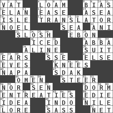 ACROSS 1. Large container 4. Rich soil 8. Prejudice 12. Flair 14. Comfort 15. At sea 16. Small island 17. Interpreter 20. Christmas carol 21. Ocean 22. Black tropical American cuckoo 23. Make a splashing sound 27. Inky black, to poets 29. On the rocks 31. Swedish rock group 34. Place in a line 35. Set of matching outer garments 36. Hearing organs 39. Compass dir. 41. Otherwise 42. Nights before holidays 43. Leg joints 46. California wine valley 47. Neighbor of Neb. 48. Sign of something about to happen 51. Bull 54. And not 56. Elected rep. 58. Dormintory (informal) 61. Pleas 66. Singer Brickell 67. The content of cognition 68. _ china 69. "Death on the ____" 70. Old wives' tales, e.g. 71. Backtalk 72. Fish or hair follower DOWN 1. Distinctive style or manner 2. In addition 3. Lies 4. Allow 5. Boat paddle 6. White ___ sheet 7. Not women's 8. Sound made by sheep 9. Byzantium, centuries later 10. Age 11. Indian skirt 13. 1994 drama film starring Jodie Foster 18. Observe 19. Experiment locale 24. Lubricate 25. _-fi 26. Coop moms 28. Fertile tracts in a desert 30. Writing tables 32. Again 33. Had dinner 34. Indian state 36. Car or cant ending 37. Actress Gardner 38. Newsperson 40. Extremities 44. Erode 45. Supplement with great effort 49. Compass dir. 50. Teachers' org. 52. Locale of original sin 53. "The Thinker" sculptor 54. Famous astronaut Armstrong 55. Southwest Nigerian state 57. Nuclear Threat Initiatives 59. Cause heat under the collar 60. Rendezvous 62. Actress Charlotte 63. _ tizzy (2 wds.) 64. Begley and Asner 65. Mayday