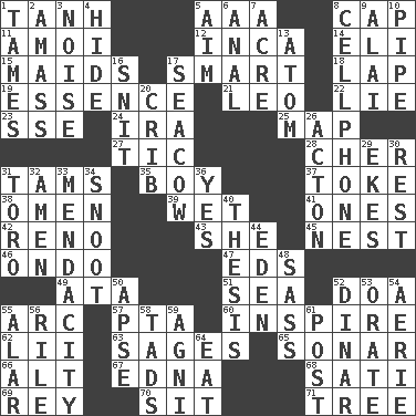 ACROSS 1. Hyperbolic tangent 5. Auto club (abbr.) 8. Head covering 11. Mine, in Marseilles 12. South American Indian 14. Biblical high priest 15. Women servants 17. Don Adams' spy role 18. Infant locale 19. Substance 21. Lion 22. Falsehood 23. Compass dir. 24. Retirement account (abbr.) 25. Atlas unit 27. Nervous spasm 28. "Mermaids" star 31. Scottish caps 35. Male child 37. Puff or smoke 38. Presage 39. Dripping 41. Singles 42. Former U.S. Attorney General Janet 43. A female animal or person 45. Egg locale 46. Southwest Nigerian state 47. Begley and Asner 49. "One Day ___ Time" 51. Ocean 52. ___ good deed 55. Curve 57. Parent Teacher Assoc. 60. Stimulate to action 62. Cards in a Roman deck? 63. Gurus 65. Underwater navigation system 66. The first octave above the treble staff 67. Pulitzer Prize-winning author Ferber 68. Suttee (variant) 69. Marina Del _, California 70. Be seated 71. Woody plant DOWN 1. Softens 2. Collect or gather 3. Annoying sound 4. Flintstone garb 5. Direct toward a target or goal 6. Of or related to the anus 7. Measure of real estate 8. Portable communications device 9. Jai ____ 10. Corncob 13. Smallest unit of an element 16. In a ____ (agitated or irritated) 17. Manatee 20. Baby bed with high sides 26. 13-14th century defensive garment 29. Supplements with great effort 30. Remainder 31. "Corrida" creature 32. So be it 33. Ananias' fault 34. Snout, nose 36. Consenting reply 40. College paper 44. Genesis locale 48. Backtalk 50. Domed church section 52. Middle Eastern gold or silver currency 53. Speak pompously 54. Nest on high 55. Having or resembling wings 56. Cause heat under the collar 58. Small boys 59. Hindu god of fire 61. Mail 64. Ingest