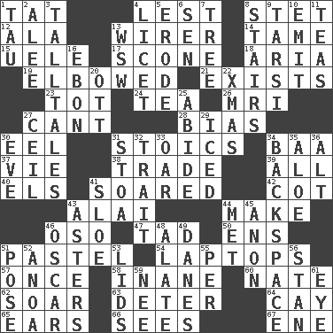 ACROSS 1. Make lace 4. For fear that 8. Proofreading order 12. Wing 13. One who wires 14. Not wild 15. Ubangi River tributary 17. Biscuitlike quick bread 18. Operatic vocal solo 19. Turned at an angle; bent 21. Is 23. Small child 24. Beverage made from leaves 26. Medical imaging device (abbr.) 27. Patter 28. Prejudice 30. Snakelike fish 31. Unemotional ones 34. Sound made by sheep 37. Compete 38. Buy and sell 39. Everything 40. Raised railways 41. Flew 42. Small bed 43. Jai ____ 44. Cause to be 46. Bear (Spanish) 47. Small boy 50. Followers of ems 51. Soft color 54. Portable computers 57. Single time 58. Empty; void 60. Nathan's nickname 62. Fly high 63. Prevent from occurring 64. Island 65. Hearing organs 66. Observes 67. Compass dir. DOWN 1. The 19th letter of the Greek alphabet 2. Toward shelter 3. Baron Munchausen's specialties 4. It is permitted: Lat. 5. Eat (away) 6. Elected rep. 7. Woody plant 8. Flight of steps 9. Tarsus (plural) 10. Send forth 11. Afternoon social gatherings 13. Compass dir. 16. Inky black, to poets 20. Baseball player Mel 22. Dec. holiday 25. Tolerate 27. To provide with a ceiling 29. On the rocks 30. First lady 31. Portico 32. Distinguishing feature 33. Boat paddle 34. Keyboard key 35. Medicinal plant 36. The first octave above the treble staff 41. _ gin 43. Michaelmas daisies 44. Was introduced to 45. At once, immediately (arch.) 46. Witty Wilde 48. Having winglike extensions 49. Natives or inhabitants of Denmark 51. Airs 52. Small Philippine buffalo 53. Hats (slang) 55. For each 56. Comedian Laurel of Laurel & Hardy 59. Born 61. Sight organ
