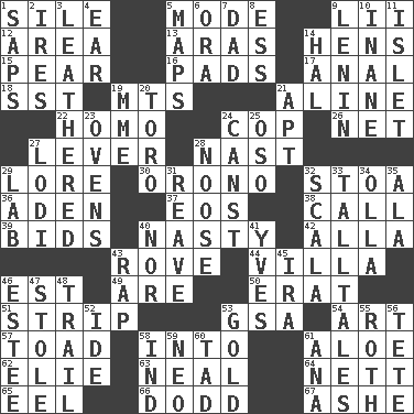 ACROSS 1. Drop; flow; fall 5. Method 9. Cards in a Roman deck? 12. Type of rug 13. Caspian sea tributary 14. Coop moms 15. Lightbulb-shaped fruit 16. Writing tablets 17. Of or related to the anus 18. Fast jet (abbr.) 19. Mountains (abbr.) 21. Place in a line 22. Like (prefix) 24. Police officer (slang) 26. Fish or hair follower 27. Crowbar 28. Political cartoonist Thomas 29. Old wives' tales, e.g. 30. U. of Maine site 32. Portico 36. Arabian gulf 37. Greek goddess of the dawn 38. Give a ring to 39. Auction offers 40. Smutty 42. Silent film actress Nazimova 43. Be footloose 44. Country estate 46. Eastern Standard Time (abbr.) 49. "We ___ not amused" (Victoria) 50. Part of Q.E.F. 51. Long narrow piece of something 53. Girls' org. (abbr.) 54. Tate display 57. Frog relative 58. To the inside or interior of 61. Medicinal plant 62. Writer Wiesel 63. Be tempered by heat 64. Remaining after all deductions 65. Snakelike fish 66. Texas town _ City 67. American tennis player Robert DOWN 1. Plant excrements 2. Angers 3. Resembling or made to resemble leather 4. Ewer handle 5. Atlas contents 6. Mouth or opening 7. June honoree 8. Curvy letter 9. Soviet premier 1918-24 10. Empty; void 11. Small island 14. Actor Linden 19. Madame (abbr.) 20. "Corrida" creature 21. Fitting 23. Baking chambers 24. 2nd pers. sing. pres. of can (arch.) 25. Bear (Spanish) 27. Farming town in central California 28. Trap for birds or small mammals 29. Experiment locale 31. Break or tear apart 32. Any of the three canals of the cochlea 33. Baron Munchausen's specialties 34. Water jar 35. Wing 40. And not 41. Jacques Cousteau's middle name 43. Hit sharply and swiftly 45. Retirement account (abbr.) 46. First name in cosmetics 47. Took without asking 48. Hang back 52. Binary compound 53. Gilded 55. Writer of Portnoy's Complaint (1969) 56. Wig 58. Indiana (abbr.) 59. Modern: prefix 60. Small amount or degree 61. Santa ___, CA