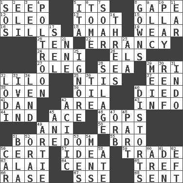 ACROSS 1. Ooze 5. It is 8. Open wide 12. Butter sub 13. A blast of a horn 15. Water jar 16. Beverly of Met fame 18. Nanny 19. Put on (as clothing) 20. "___ Little Indians" 22. Tendancy to err 24. Painter Guido (1575-1642) 26. Raised railways 27. Cassini of fashion 28. Ocean 29. Medical imaging device (abbr.) 32. _ and Stitch 35. Nuclear Threat Initiatives 37. Car or cant ending 38. Baking chamber 39. Lubricate 40. Passed on 41. One of the 12 tribes of Israel 42. Type of rug 43. A message received and understood 44. Working for oneself (abbr.) 45. Adept person 46. Republicans 49. Black tropical American cuckoo 50. Part of Q.E.F. 51. Mood resulting from idleness 55. Sis' sibling 56. Foregone conclusion 57. It may be bright or harebrained 59. Barter 63. Mountain range southwest of Kyrgyzstan 64. Penny 65. Unclean, religiously 66. To erase 67. Compass dir. 68. Emitted DOWN 1. Mayday 2. Biblical high priest 3. Snakelike fish 4. Characterized by complete cowardliness 5. Call ___ day 6. Heavy book 7. Fly high 8. Women's formal wear 9. Actor Baldwin 10. Romp 11. Hearing organ 14. Threesomes 17. Stitch closed the eyes of (a falcon) 21. Compass dir. 23. According to 25. Refuse to acknowledge 28. Fodder prepared in a silo 29. Count _ (2 wds.) 30. Coral collection 31. _ china 32. Farming town in central California 33. "Terrible" tsar 34. Grant temporary use of 36. Neckwear 40. What propaganda does 42. Being or containing an acid 45. One (Scot) 47. Globe 48. Role in a play 49. Nick name for Arthur 51. Actor Lugosi 52. Mouths or openings 53. Lyric poems 54. Not women's 56. 4-wheeled motor vehicle 58. Had dinner 60. "We ___ not amused" (Victoria) 61. Lair 62. Bank Draft (abbr.)