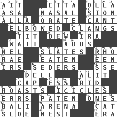 ACROSS 1. Small island 4. Singer James 8. Water jar 12. White ___ sheet 13. Relating to the nose 14. The Jewish people; Israel 15. Silent film actress Nazimova 17. Speak pompously 18. Patter 19. Shoved, as through a crowd 21. Rings like a ship's bell 23. Teat (slang) 24. Morning condensation 26. Lyricist Gershwin 27. Electrical Unit 28. Sums up 30. Cartoonist voice _ Blanc 31. Chalkboards 34. 17th letter of the Greek alphabet 37. Actress Charlotte 38. Eroded 39. Car or cant ending 40. Big collection agency 41. Spring feasts 42. Compass dir. 43. Small valley 44. Set down 46. Head covering 47. Double-curved letter 50. To free from 51. Cooks with dry heat, as in an oven 54. Winter's stalactites 57. Blunders 58. Eucharist need 60. Singles 62. Indonesian resort city 63. Sports stadium 64. Feline 65. A type of plum 66. A home for chicks 67. Epoch DOWN 1. Auto club (abbr.) 2. Capri or Wright 3. Baron Munchausen's specialties 4. Having ears or earlike features 5. Sadhe (variant) 6. Make lace 7. Actor Baldwin 8. Motion picture awards 9. Woody, climbing, usually tropical plant 10. Having great length 11. Pismires 13. Immediately 16. "This won't hurt ____!" 20. Baseball player Mel 22. Flaplike coverings 25. Wetness 27. Put on (as clothing) 29. Hiding places for outlaws 30. Medical imaging device (abbr.) 31. Stitch closed the eyes of (a falcon) 32. Dipping utensil 33. Had dinner 34. Home 35. Behest 36. Single 41. Back-to-school mo. 43. Hyrax 44. Curve 45. _ and Stitch 46. Monte _, Las Vegas Hotel/Casino 48. Settings 49. Aroma 51. Confederate soldiers (slang) 52. Taken by mouth 53. Connect, as a bridge 55. _ tizzy (2 wds.) 56. Wither 59. "We ___ not amused" (Victoria) 61. R.R. building