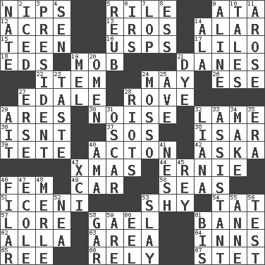 ACROSS 1. Pinches, bites 5. Cause heat under the collar 9. _ moment's notice (2 wds.) 12. 43,560 square feet 13. Greek god of love 14. Having or resembling wings 15. Adolescent 16. United States Postal Service (abbr.) 17. _ and Stitch 18. Begley and Asner 19. Disorderly crowd 21. Natives or inhabitants of Denmark 22. Detail 24. Fifth month 26. Compass dir. 27. Peak District village in England 28. Be footloose 29. Ancient Greek god of war 30. Annoying sound 32. Unable to walk 36. Is not 37. Mayday 38. Austrian river, tributary to the Danube 39. False hair 40. Gambison 42. "____ silly question..." 43. Dec. holiday 44. Bert's buddy 46. Opposite of masc. 49. Automobile 50. Oceans 51. Ancient Celtic tribe of eastern Britain 53. Like a shrinking violet 54. Make lace 57. Old wives' tales, e.g. 58. Highlander 61. Object of repulsion 62. Silent film actress Nazimova 63. Length times width 64. Lodging establishments 65. To separate or throw off 66. Have confidence or faith in 67. Proofreading order DOWN 1. Nathan's nickname 2. On the rocks 3. Elected leader of a country 4. Elected rep. 5. Reuben's nickname 6. Big collection agency 7. Chop off 8. Double-curved letter 9. Place in a line 10. Lies 11. Came up 14. Insect wing 19. Cartoonist voice _ Blanc 20. Sign of things to come 21. Color 23. Clothes sense 24. With motion or animation 25. "___ Maria" 27. Celtic language 28. Disturbances 29. Small island 31. Witty Wilde 32. Climbing, woody, usually tropical vines 33. Helper 34. Cause to be 35. Epoch 40. Housemaid (var.) 41. Soft 43. One more than ninety 45. Marina Del _, California 46. Having threads 47. Learning spot: Fr. 48. Haggard of country music 52. Teachers' org. 53. Kill 55. Singer Murray 56. Trial 58. Slender fish 59. "We ___ not amused" (Victoria) 60. Snakelike fish 61. Altar cloth linen
