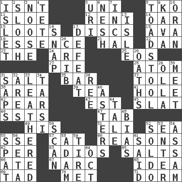ACROSS 1. Is not 5. Corn or form start 8. Ring climax 11. A type of plum 12. Painter Guido (1575-1642) 14. Rowing implement 15. Plunders 17. Plates 18. Actress Gardner 19. Core 21. Actor Linden 22. One of the 12 tribes of Israel 23. Definite Article 24. Sandy's bark 25. Greek goddess of the dawn 27. Sliced dessert 28. Tiny particle 31. Table seasoning 35. Drinking establishment 37. Lacquered or enameled metalware 38. Type of rug 39. Afternoon social gathering 41. Hollow 42. Lightbulb-shaped fruit 43. Eastern Standard Time (abbr.) 45. Narrow board 46. Fast planes 47. Bar bill 49. Part of HMS, perhaps 51. Connecticut Ivy Leaguer 52. Ocean 55. Compass dir. 57. Domesticated feline 60. Thinks logically 62. For each 63. Goodbye (Sp.) 65. Table seasonings 66. Had dinner 67. Drug cop 68. The main thing one is thinking about 69. Small amount or degree 70. Was introduced to 71. Dormintory (informal) DOWN 1. Small island 2. Splash clumsily 3. Trap for birds or small mammals 4. Wig 5. RI univ. 6. Tender 7. South American Indian 8. Inedible or poisonous agaric 9. Polynesian shrub of the pepper family 10. NW Algerian seaport 13. Small island 16. Fastener 17. Outscore 20. Baby bed with high sides 26. Profane or obscene expressions 29. Spanish pot 30. Rendezvous 31. Plant excrements 32. Ancient Greek god of war 33. Tough but pliablecoriaceous 34. Tarsus (plural) 36. To separate or throw off 40. Michaelmas daisies 44. Lie 48. Prejudice 50. Examine hastily 52. Twentieth part of a lira 53. Keyboard key 54. Indian state 55. Argument over a trivial matter 56. Bristle 58. First man 59. Hoop that covers a wheel 61. Stated 64. Sep. follower