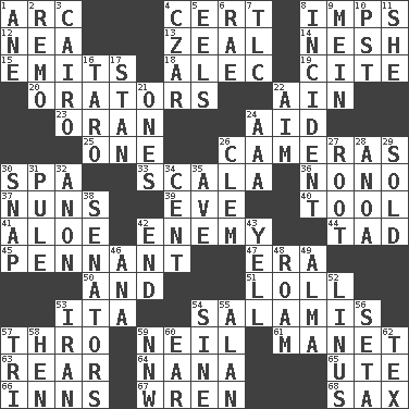ACROSS 1. Curve 4. Certainty 8. Naughty children 12. Teachers' org. 13. Ardor 14. Tender 15. Sends forth 18. Actor Baldwin 19. Quote 20. Speakers 22. The 18th letter of the Arabic alphabet 23. NW Algerian seaport 24. Help 25. Single 26. Devices for capturing images 30. Health resort 33. Any of the three canals of the cochlea 36. Words to Nanette 37. Religious women 39. First lady 40. Utensil 41. Medicinal plant 42. Foe 44. Small amount or degree 45. Pre-World Series prize 47. Period 50. Also 51. Hang loosely or laxly 53. Call ___ day 54. Deli grouping 57. Through, poetically 59. Famous astronaut Armstrong 61. French painter Edouard 63. Posterior 64. Grandmother 65. Shoshoni 66. Lodging establishments 67. Songbird 68. Saxophone DOWN 1. One (Scot) 2. San ____ (Riviera town) 3. Capital of Egypt 4. Russian ruler of old 5. Snakelike fish 6. Actress Charlotte 7. Affectionate concern, for short 8. Event 9. Count _ (2 wds.) 10. Pacific Standard Time (abbr.) 11. A female animal or person 16. Edible starchy tuberous root 17. Comedian Laurel of Laurel & Hardy 21. Washington bills 22. Direct toward a target or goal 24. American Automobile Association (abbr.) 26. To starve (Brit.) 27. Carrot, for example 28. Small Philippine buffalo 29. Exchanged or delivered for money 30. Fastener 31. Whimper 32. At once, immediately (arch.) 34. Penny 35. "___ Maria" 38. Elected representatives 42. Conclusion 43. Shout 46. Santa ___, CA 48. Wander aimlessly 49. _ mater 52. "_ and Lucy" (Charlie Brown theme song) 53. SW Asia republic 54. Trig term 55. Actor Alda or Thicke 56. Stalk of a moss capsule 57. Three (prefix) 58. Layer 59. Compass dir. 60. Hearing organ 62. John Ritter's dad