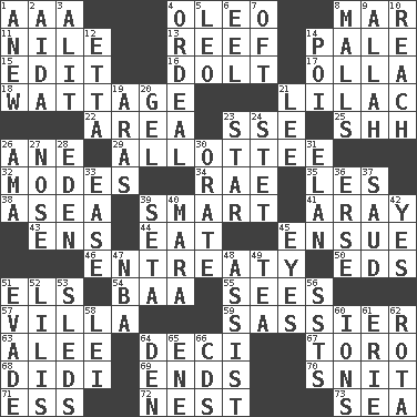 ACROSS 1. Auto club (abbr.) 4. Butter sub 8. Make imperfect 11. "Death on the ____" 13. Coral collection 14. Diluted with white 15. Prepare for publication 16. Dunce 17. Spanish pot 18. Electrical Measurement 21. Pale purple color 22. Type of rug 23. Compass dir. 25. Quiet! 26. One (Scot) 29. One to whom something is allotted 32. Methods 34. Actress Charlotte 35. French article 38. At sea 39. Don Adams' spy role 41. Like ___ of sunshine 43. Followers of ems 44. Consume 45. Take place subsequently 46. Plea 50. Begley and Asner 51. Raised railways 54. Sound made by sheep 55. Observes 57. Country residence 59. More disrespectful 63. Toward shelter 64. Tenth: prefix 67. "Corrida" creature 68. "You Light Up My Life" star Conn 69. Conclusions 70. In a ____ (agitated or irritated) 71. Curvy letter 72. Egg locale 73. Ocean DOWN 1. Afresh 2. Opera by Verdi 3. Set down 4. Severe or trying experience 5. Lion 6. Snakelike fish 7. Often (poetically) 8. Promenades 9. Assad's deity 10. Arrive at 12. Singer James 14. Luau course 19. Caspian sea tributary 20. Set 21. Area sheltered from the wind 23. Play the lead 24. Proofreading order 26. Nanny (var.) 27. Characteristic smell of wine 28. Genesis locale 30. Speak pompously 31. Style 33. Relaxation 36. Celtic language 37. Saudi Arabian king (1953-1964) 39. Stalk of a moss capsule 40. Hindu Mythology: god of death 42. Consenting reply 45. Snake ____ (dice throw) 47. Basketball assoc. 48. Aid 49. Afternoon social gathering 51. Elude 52. Ms. Damita and namesakes 53. Bobsleighs 56. Fast planes 58. Flowery wreath 60. Charged particles 61. 4th largest of the Great Lakes 62. Roll call or roster of names 64. Lair 65. Compass dir. 66. Music discs