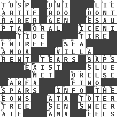 ACROSS 1. Cook's measure (abbr.) 5. Corn or form start 8. Falsehood 11. Nick name for Arthur 13. Friend of Pooh 14. Do not 15. Less widely known 16. Commissioned military rank (abbr.) 17. Son of Isaac 18. Parent Teacher Association (abbr.) 19. Taken by mouth 21. Ancient Celtic tribe of eastern Britain 22. Periodic rise and fall of the sea level 24. Become fatigued 25. Main course 27. Ocean 29. Small Philippine buffalo 30. Country residence 32. Monthly bill 33. Rends 35. Plant excrements 39. Be 41. Turn sharply 42. Was introduced to 43. Threatening words 45. Length times width 48. A pale, very dry sherry 49. Practice fights 50. A message received and understood 52. Definite Article 55. Immeasurably long periods of time 56. _ moment's notice (2 wds.) 57. Carrier 59. Relationship diagram 60. Elected rep. 61. Scornful expression 62. Had dinner 63. Wet nurse (var.) 64. Snakelike fish DOWN 1. Canvas cover 2. Naughty child 3. Ski resort town in Vermont 4. Sliced dessert 5. Capital and largest city of Mongolia 6. Christmas carol 7. Electrically charged atom 8. Failure 9. Lacking in sense or substance 10. Needle holder 12. Eat (away) 14. Tenth: prefix 20. To separate or throw off 21. Slanted text style (abbr.) 23. Feeling or showing extreme anger 25. Ewer handle 26. Compass dir. 27. Title for a knight 28. Raised railways 30. Large container 31. NE Netherlands city 33. Neckwear 34. Eastern Standard Time (abbr.) 36. One to whom something is allotted 37. Suppuration 38. Observe 40. Dec. holiday 43. Below a satisfactory level 44. Debaucheries 45. To the left, to Queeg 46. The wife of a rajah (variant) 47. Celtic language 49. Bristle 50. Detail 51. Grandmother 53. Person who is morally reprehensible 54. Blunders 56. White ___ sheet 58. Single