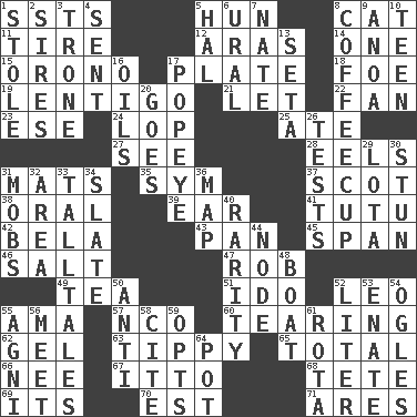 ACROSS 1. Fast planes 5. Attila the _ 8. Feline 11. Become fatigued 12. Caspian sea tributary 14. Single 15. U. of Maine site 17. Food holder 18. Enemy 19. Small, flat, pigmented spot on the skin 21. Allow 22. Air blower 23. Compass dir. 24. Chop off 25. Had dinner 27. Observe 28. Snakelike fish 31. Floor coverings 35. Symbol (abbr.) 37. Highlander 38. Spoken 39. Ewer handle 41. Ballerina skirt 42. Actor Lugosi 43. Baking dish 45. Connect, as a bridge 46. Table seasoning 47. Director Reiner 49. Beverage made from leaves 51. Wedding promise 52. Lion 55. Nursemaid (var.) 57. Non-commissioned officer (abbr.) 60. Pulling apart 62. Set 63. Likely to tip or tilt 65. "_____ Recall" 66. Born 67. "Tell ____ the Marines!" 68. Wig 69. It is 70. Eastern Standard Time (abbr.) 71. Ancient Greek god of war DOWN 1. Fur scarf 2. Fathers 3. Marketplace scale 4. Emitted 5. Actor Linden 6. Mountain range 7. Nathan's nickname 8. Java holder (2 wds.) 9. Small Philippine buffalo 10. Adolescent 13. Bristle 16. Lubricates 17. Wimpy's pal 20. Leaves 26. Trials 29. Globular water bottle used in Asia 30. Surprise greatly 31. Disorderly crowds 32. Type of rug 33. Baron Munchausen's specialties 34. Schedule 36. Atlas unit 40. Noteworthy scarcity 44. Thickened enlargement 48. Water vessel 50. Against 52. 61 cubic inches 53. Related on the mother's side 54. Stares 55. Hindu god of fire 56. Confront 58. Quote 59. Chooses 61. Roll call or roster of names 64. Plant holder