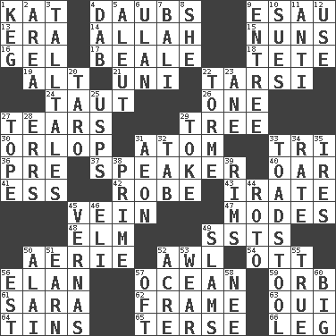 ACROSS 1. Krazy ___ of comics 4. Applies to a surface 9. Son of Isaac 13. Period 14. Assad's deity 15. Religious women 16. Set 17. Memphis, Tenn. Street 18. Wig 19. Keyboard modifier key 21. Single; one (prefix) 22. Tarsus (plural) 24. Drawn tight 26. Single 27. Pulls into pieces 29. Woody plant 30. Fourth or lowest deck 31. Smallest unit of an element 33. Three (prefix) 36. Before (prefix) 37. Orator 40. Boat paddle 41. Curvy letter 42. Loose flowing garment 43. Feeling or showing extreme anger 45. Distinctive style or manner 47. Methods 48. Shade tree 49. Fast planes 50. Nest on high 52. Leather borer 54. Baseball player Mel 56. Flair 57. Sea 59. Globe 61. "Two Mules for Sister ____" 62. Movie unit 63. Fr. "Yes" 64. Canisters 65. Laconic 66. Part of a journey DOWN 1. Barrel 2. Length times width 3. Baron Munchausen's specialties 4. Apply (a substance) by light strokes 5. Native American of Southwest Alaska 6. ____ Bator 7. Indonesian resort city 8. A female animal or person 9. Main course 10. Takes to court 11. Against 12. Purpose 20. Edible starchy tuberous root 22. Singer Mel 23. A saturated hydrocarbon 25. United States Postal Service (abbr.) 27. Drink excessively 28. Blunders 29. Puff or smoke 31. Period of immesurable duration 32. Bar bill 33. Inedible or poisonous agaric 34. Assign a rank or rating to 35. Angers 38. A-one 39. Basketball hoops 44. Printing process, for short 45. Actresses Bloom and Felton 46. Connecticut Ivy Leaguer 49. Shuts with force 50. Jai _ 51. Merit 52. 43,560 square feet 53. Put on (as clothing) 55. Loyal 56. Eastern Standard Time (abbr.) 57. Often (poetically) 58. Born 60. Large