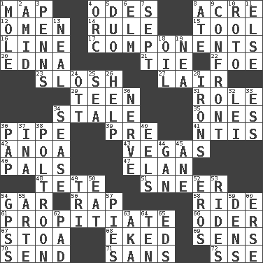 ACROSS 1. Atlas unit 4. Lyric poems 8. 1/640 square mile 12. Sign of something about to happen 14. General guideline 15. Implement 16. Actor's bit 17. Pieces 20. Pulitzer Prize-winning author Ferber 21. Make a knot 22. Enemy 23. Splash clumsily 27. Den 29. Adolescent 31. Hero or heavy, e.g. 34. Showing deterioration from age 35. Singles 36. Corncob 39. Before (prefix) 41. Nuclear Threat Initiatives 42. Small Philippine buffalo 43. Viva Las _ 46. Friends 47. Flair 48. Wig 51. Contemptuous expression 54. Slender fish 56. Hit sharply and swiftly 58. Travel on or in a vehicle 61. Appease 66. Baltic tributary 67. Portico 68. Made supply last 69. Elected reps. 70. Post 71. Without 72. Compass dir. DOWN 1. Undercover agent 2. Among 3. Actor Sean's family 4. The grampus (Milton) 5. Superhero pair 6. Shade tree 7. Back-to-school mo. 8. Had dinner 9. Meet 10. Printing process, for short 11. Otherwise 13. Anneal 18. Petroleum 19. Teachers' org. 24. Baseball player Mel 25. Ocean 26. Aid 28. Metal shackles 30. Boldness 32. Luau accessory 33. Double-curved letter 34. Gospel singer Marvin 36. Infant food 37. _ tizzy (2 wds.) 38. Characterized by complete cowardliness 40. Snakelike fish 44. Separate the seeds from cotton 45. A saturated hydrocarbon 49. Three (prefix) 50. Consume 52. Greek god of love 53. Amusement-park features 54. Global Positioning Systems (abbr.) 55. Johnson of "Laugh-In" 57. Sliced desserts 59. Habitations of wild animals 60. Celtic language 62. Groovy apt. 63. Alias (abbr.) 64. "___ Little Indians" 65. Begley and Asner