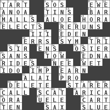 ACROSS 1. Small pie 5. Distress signal 8. She-sheep 11. Small Philippine buffalo 12. Canisters 14. Drinking establishment 15. Promenades 17. Medicinal plant 18. Israeli folk dance 19. Opts 21. Summer TV shows 23. One more than two 25. Locale of original sin 26. Blunders 27. Symbol (abbr.) 28. Three (prefix) 31. Title for a knight 33. Followers of ems 35. Flexible twig of a willow tree 37. Without 38. Pull behind 40. Pulitzer Prize-winning author Ferber 41. Amusement-park features 43. Born 45. Dripping 46. Wedding promise 47. Naughty child 50. Merit 52. Jai ____ 53. Adept person 54. Erase 56. A viewer who gazes fixedly 61. Give a ring to 62. Get outta here! 65. N. Chile seaport 66. Mouth or opening 67. Ubangi River tributary 68. Draw slowly or heavily 69. "___ Little Indians" 70. Saxophone 71. Change direction abruptly DOWN 1. Not wild 2. Of or related to the anus 3. Hero or heavy, e.g. 4. Baby powder 5. R.R. building 6. Petroleum 7. Sounds asleep 8. Inky black, to poets 9. Armed conflicts 10. Epoch 13. Shabby and untidy 16. Use a spoon 18. Attila the _ 20. The founder of a family 22. San ____ (Riviera town) 24. Is not 26. Celtic language 28. Event that recurs at intervals 29. Monthly bill 30. Lyricist Gershwin 31. Expressed in words 32. _ china 34. Manchild 36. Stitched 37. _ Lanka 39. Shed a tear 42. Filth; sediment 44. Hearing organs 48. Taiwanese island in East China Sea 49. Components 51. Roll call or roster of names 52. Everything 54. Have the gumption 55. Style 57. Curves 58. Monetary unit of Yemen 59. Shade of tan 60. Assign a rank or rating to 61. Small bed 63. According to 64. John Ritter's dad