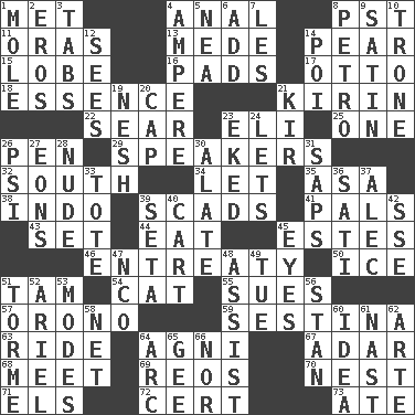 ACROSS 1. Was introduced to 4. Of or related to the anus 8. Pacific Standard Time (abbr.) 11. Mouths or openings 13. Ancient Persian 14. Lightbulb-shaped fruit 15. Ear part 16. Writing tablets 17. Von Bismarck 18. Substance 21. Japanese brewing company 22. Burn superficially 23. Biblical high priest 25. Single 26. Fenced enclosure 29. Orators 32. 180 degrees 34. Allow 35. White ___ sheet 38. Southeast Asian peninsula 39. Loads 41. Friends 43. Put into a specified state 44. Consume 45. _____ Park, CO 46. Plea 50. Frozen water 51. Scottish cap 54. Feline 55. Takes to court 57. U. of Maine site 59. French poetic form 63. Travel on or in a vehicle 64. Hindu god of fire 67. The sixth month of the Jewish calendar 68. Rendezvous 69. Vintage cars 70. Egg locale 71. Raised railways 72. Sure thing 73. Had dinner DOWN 1. Undercover agent 2. Greek god of love 3. Bar bills 4. Electrical Unit 5. Teachers' org. 6. Increase 7. French article 8. Stone: prefix 9. Smooth fabric 10. Heavy duty weighing machine 12. Observes 14. Luau course 19. Tender 20. Head covering 21. Apertif with cassis 23. Supplemented with great effort 24. Allows 26. 23rd letter of the Greek alphabet 27. Immeasurably long periods of time 28. Unadorned 30. Having winglike extensions 31. Plant excrements 33. Carry 36. Suttee (variant) 37. Actor Baldwin 39. Bristle 40. Draw slowly or heavily 42. Compass dir. 45. Sight organs 47. Non-commissioned officer (abbr.) 48. Aid 49. Third day of the wk. 51. Singer Mel 52. Satellite of Uranus 53. Methods 56. Comedian Laurel of Laurel & Hardy 58. Fish or hair follower 60. It may be bright or harebrained 61. Political cartoonist Thomas 62. Johnson of "Laugh-In" 64. Curve 65. Unit of force equal to gravity 66. Or not