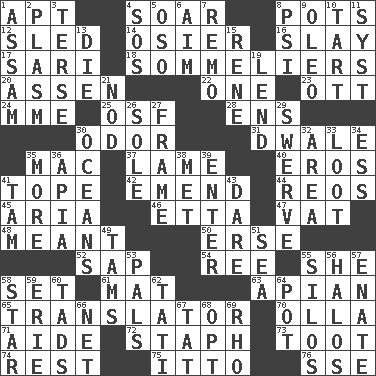 ACROSS 1. Fitting 4. Fly high 8. Cooking vessels 12. Downhill vehicle 14. Flexible twig of a willow tree 16. Kill 17. Indian skirt 18. Wine waiters 20. NE Netherlands city 22. Single 23. Baseball player Mel 24. Madame (abbr.) 25. Order of Saint Francis (abbr.) 28. Followers of ems 30. Aroma 31. A sleeping potion; an opiate (poet.) 35. Big _ 37. Unable to walk 40. Greek god of love 41. Drink excessively 42. Make improvements or corrections to 44. Vintage cars 45. Operatic vocal solo 46. Singer James 47. Large container 48. Intended 50. Celtic language 52. Plant excrement 54. To sift 55. A female animal or person 58. Put into a specified state 61. Floor protector 63. Bee-related 65. Interpreter 70. Rounded earthenware pot or jar 71. Helper 72. Staphylococcus 73. A blast of a horn 74. Relief 75. "Tell ____ the Marines!" 76. Compass dir. DOWN 1. Indian state 2. Suffix with ecto or cyto 3. Laconic 4. Mayday 5. Bear (Spanish) 6. Direct toward a target or goal 7. San ____ (Riviera town) 8. Air pressure measure (abbr.) 9. Butter sub 10. Small pie 11. System (abbr.) 13. Pass on 15. French philosopher Descartes 19. Grant temporary use of 21. Allow head to fall sleepily 26. Flatfish 27. Movie unit 29. Turn aside suddenly 30. Seas 32. Length times width 33. Spoils 34. Curvy letter 35. Greater amount 36. Capital of Western Samoa 38. Was introduced to 39. Keyboard key 41. Scottish cap 43. Have the gumption 49. Scottish caps 51. Ocean 53. Friends 55. Grain storage towers 56. Radiant circles of light 57. Related on the mother's side 58. Play the lead 59. One of the Great Lakes 60. Small amounts or degrees 62. Jacques of French films 64. Plant holder 66. Fish or hair follower 67. Make lace 68. Choose 69. 17th letter of the Greek alphabet