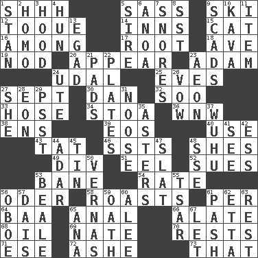 ACROSS 1. Quiet! 5. Backtalk 9. What Jean-Claude Killy likes to do 12. Woman's close-fitting hat 14. Taverns 15. Domesticated feline 16. Amid 17. Carrot, for example 18. "___ Maria" 19. Dreamland 20. Seem 23. First of billions? 24. Allodial 25. Nights before holidays 27. Back-to-school mo. 30. Daniel's nick name 32. "Barney Miller" actor Jack 33. Flexible conduit 34. Portico 36. Compass dir. 38. Followers of ems 39. Greek goddess of the dawn 40. Purpose 43. Make lace 46. Fast planes 48. "______ My Girl" (Turtles hit) 49. HTML Container Element 51. Snakelike fish 52. Institutes legal proceedings 53. Object of repulsion 54. Pace 56. River in Europe 58. Exposes to great heat 61. For each 64. Sound made by sheep 65. Of or related to the anus 66. Having winglike extensions 68. Lubricate 69. Nathan's nickname 70. Musical pauses 71. Compass dir. 72. American tennis player Robert 73. Not this but _ DOWN 1. Comedian Laurel of Laurel & Hardy 2. Like (prefix) 3. Parka part 4. Attila the _ 5. Father 6. Small Philippine buffalo 7. Sounds asleep 8. Fast jet (abbr.) 9. Loads 10. Polynesian shrub of the pepper family 11. A distinct part 13. Mild oath 21. Groovy apts. 22. Food holders 23. Age 24. Shoshoni 26. Solemn pledge 27. A female animal or person 28. Age 29. Inconspicuous attention getter 31. Trap for birds or small mammals 35. Michaelmas daisies 37. Chinese city south-southwest of Nanjing 41. Observe 42. Curvy letter 44. The sixth month of the Jewish calendar 45. Shallow baking pan 47. Narrow board 48. Compass dir. 50. Actresses Bloom and Felton 53. Memphis, Tenn. Street 55. Russian ruler of old 56. Mitch Miller's instrument 57. Raised platform 59. Pledge 60. Toward shelter 61. Romantic infatuation 62. Singer James 63. Relief 65. Santa ___, CA 67. Allow
