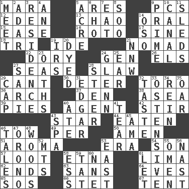 ACROSS 1. Hindu Mythology: god of death 5. Ancient Greek god of war 9. Personal Computers (abbr.) 12. Paradise 13. US Secretary of Labor Elaine L. _ 14. Of the mouth 15. Comfort 16. Printing process, for short 17. Trig term 18. Three (prefix) 19. Binary compound 21. Roamer 22. Small, narrow, flatbottom fishing boat 24. Commissioned military rank (abbr.) 26. Raised railways 27. Gospel singer Marvin 28. Cole _ (cabbage dish) 29. Patter 30. Prevent from occurring 32. "Corrida" creature 36. Bowlike part 37. Lair 38. Toward the sea 39. Sliced desserts 40. Representative 42. Use a spoon 43. Play the lead 44. Consumed 46. Pull behind 49. For each 50. So be it 51. Scent 53. Period 54. Manchild 57. Plunder 58. Inactive volcano in Sicily 61. Pale green bean 62. Conclusions 63. Without 64. Nights before holidays 65. Distress signal 66. Proofreading order 67. Portable shelter DOWN 1. Confront 2. The sixth month of the Jewish calendar 3. Dwelling 4. A saturated hydrocarbon 5. Measure of real estate 6. 17th letter of the Greek alphabet 7. Erode 8. "Barney Miller" actor Jack 9. A-one 10. Lessep's creation 11. Bobsleighs 14. Bear (Spanish) 19. Big collection agency 20. Colored 21. Compass dir. 23. Profane or obscene expressions 24. American astronaut and politician John 25. Hearing organ 27. Indian skirt 28. Navigate 29. Head covering 31. _ Allan Poe 32. Clothes sense 33. Clearly or manifestly demonstrative 34. It's straight from the horse's mouth 35. Boat paddle 40. Had dinner 41. Rend 43. Health resort 45. Nursemaid (var.) 46. Stories 47. U. of Maine site 48. Forest 52. Mountains (abbr.) 53. Compass direction 55. Sign of things to come 56. Political cartoonist Thomas 58. Double-curved letter 59. Make lace 60. Compass dir. 61. Allow