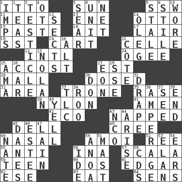 ACROSS 1. "Tell ____ the Marines!" 5. Player for Phoenix 8. Compass dir. 11. Confronts 13. Compass dir. 14. Von Bismarck 15. Thick mixture 16. Small island 17. Den 18. Fast jet (abbr.) 19. Heavy open wagon 21. Cell (Danish) 22. International (abbr.) 24. Double curve, resembling the letter S 25. Buttonhole 27. Eastern Standard Time (abbr.) 29. Promenade 30. Administered medicine 32. Length times width 33. Marketplace scale 35. Raze (variant) 39. Thermoplastic polyamide 41. So be it 42. Environmental prefix 43. Slept 45. Small valley 48. Algonquian 49. Relating to the nose 50. Mine, in Marseilles 52. To sift 55. Opposed to 56. _ tizzy (2 wds.) 57. Any of the three canals of the cochlea 59. Adolescent 60. Two (Sp.) 61. _ Allan Poe 62. Compass dir. 63. Erode 64. Elected reps. DOWN 1. Naughty children 2. Beverages made from leaves 3. A testis 4. Baseball player Mel 5. Wither 6. A single undivided whole 7. Fish or hair follower 8. Showing deterioration from age 9. Vertical member of a panel or frame 10. Had on 12. Religious groups 14. Cassini of fashion 20. The first octave above the treble staff 21. ____ d'Azur (French Riviera) 23. Pitcher Ryan 25. Nursemaid (var.) 26. Automobile 27. A really long time 28. Compass dir. 30. Spanish title 31. Window treatment 33. Affectionate concern, for short 34. Friend of Pooh 36. Electrical Measurement 37. Perceive with the eye 38. Conclude 40. Shout 43. Non-commissioned officer (abbr.) 44. Ascend 45. Natives or inhabitants of Denmark 46. First name in cosmetics 47. (Had) reclined 49. Nathan's nickname 50. Small Philippine buffalo 51. Vertical spar for supporting sails 53. Enthusiasm 54. Hearing organs 56. Binary compound 58. Music discs