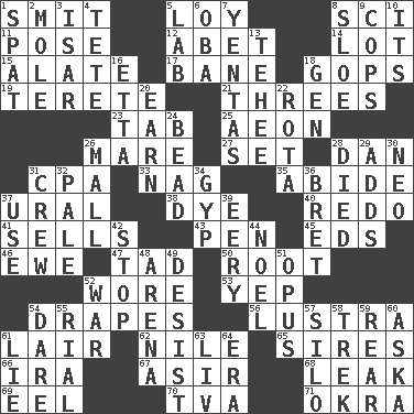 ACROSS 1. Stricken, poetically 5. Myrna of the movies 8. _-fi 11. Airs 12. Collude with 14. Car dealer's back yard 15. Having winglike extensions 17. Object of repulsion 18. Republicans 19. Cylindrical with tapered ends 21. Triplets 23. Bar bill 25. A really long time 26. Female horse 27. Put into a specified state 28. Daniel's nick name 31. Tax preparer (abbr.) 33. Tired old horse 35. Remain 37. Mountain range 38. Color 40. Redecorate 41. Makes a sale 43. Writing instrument 45. Begley and Asner 46. She-sheep 47. Small amount or degree 50. Carrot, for example 52. Had on 53. Slangy assent 54. Window treatments 56. A period of five years 61. Den 62. Mediterranean tributary 65. Founders of families 66. Lyricist Gershwin 67. SW Saudi Arabia district 68. Path through which fluid escapes 69. Snakelike fish 70. Federal power corp. 71. Gumbo ingredient DOWN 1. Argument over a trivial matter 2. Undercover agent 3. Austrian river, tributary to the Danube 4. Wig 5. Experiment locale 6. Chief or king in Benin or Nigeria 7. Gossips 8. A type of plum 9. 911 reaches them 10. ___ a Wonderful Life 13. Giggle 16. Singer James 18. Commissioned military rank (abbr.) 20. Merit 22. Roll call or roster of names 24. Necklace unit 26. Shopping center 28. Passed on 29. Sums up 30. Modern: prefix 31. Ship's personnel 32. Diluted with white 34. Con 36. Cy Young winner Saberhagen 37. Purpose 39. Suggestive of the supernatural 42. Discontinue 44. Christmas carol 48. Sports stadium 49. Stop 51. Musical composition 52. Armed conflict 54. Have the gumption 55. Monetary unit of Yemen 57. Grain storage tower 58. Long journey 59. Posterior 60. "____ silly question..." 61. Falsehood 63. 54 in ancient Rome 64. Period