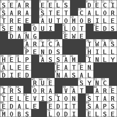 ACROSS 1. Wither 5. Snakelike fish 9. Tenth: prefix 13. "Two Mules for Sister ____" 14. Proofreading order 15. Bodily heat indicating an inflammation 16. Woody plant 17. Form of transportation 19. Elected rep. 20. Fr. "Yes" 21. Car dealer's back yard 22. Begley and Asner 23. Mild oath, euphamism for damn 25. She-sheep 26. N. Chile seaport 30. It was, poetically 34. Depends 35. Land elevation 36. Assist 39. Indian state 42. In an inward manner 43. Toward shelter 44. Eroded 46. Passed on 47. Relating to the nose 48. Regret 51. Synchronize (abbr.) 54. Big collection agency 57. Mouth or opening 58. Large container 60. "We ___ not amused" (Victoria) 62. Boob tube 65. Play the lead 66. Peak District village in England 67. Prepare for publication 68. Plant excrements 69. Disorderly crowds 70. Farming town in central California 71. Otherwise DOWN 1. Fast planes 2. Having ears or earlike features 3. Sports stadium 4. Actress Charlotte 5. Son of Isaac 6. Needle holder 7. Allow 8. Took without asking 9. Small moist lump or mass 10. Writer Wiesel 11. Chilled 12. Angers 15. ____ d'Azur (French Riviera) 18. Cut the grass 20. Legendary monster 24. Slept 27. _ tizzy (2 wds.) 28. Music discs 29. NE Netherlands city 30. Without force or sincere effort 31. Victory 32. 100% 33. Playfully artful 36. Possessed 37. Biblical high priest 38. Area sheltered from the wind 40. American Automobile Association (abbr.) 41. Mountains (abbr.) 45. 90 degrees 48. Be footloose 49. RI univ. 50. Artist's stand 52. Relating to or accompanying birth 53. Dice game 54. Detail 55. Redecorate 56. Broad, flat, thick piece 58. Empty area or space 59. Opposed to 61. Celtic language 63. Raised railways 64. Wedding promise 65. Compass dir.