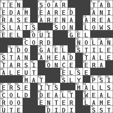 ACROSS 1. Nine, plus one 4. Fly high 8. Bar bill 11. Dutch treat 13. Having ears or earlike features 15. Black tropical American cuckoo 16. Raze (variant) 17. Sports stadium 18. Length times width 19. Narrow boards 21. Boy, to dad 22. Moos 23. Snakelike fish 24. Fr. "Yes" 27. Set 29. Drawstring 30. Pitcher Ryan 34. Wedding promise 36. Highlander 39. Vertical member of a panel or frame 40. Comedian Laurel of Laurel & Hardy 41. Toward the future 43. Story 44. Tarsus (plural) 46. At one time in the past 47. Epoch 48. Native American of Southwest Alaska 49. Otherwise 51. Floor protector 53. Secret 54. 23rd letter of the Greek alphabet 57. Celtic language 60. It is 63. Shopping centers 65. Chilled 66. Started a card game 69. Welt 70. Friend of Pooh 71. Keyboard key 72. Unable to walk 73. Shoshoni 74. "You Light Up My Life" star Conn 75. Fast jet (abbr.) DOWN 1. Laconic 2. Peak District village in England 3. Relating to the nose 4. Ocean 5. Boat paddle 6. Ancient Greek god of war 7. Western Nevada city 8. Pacific island yam 9. Afresh 10. Prejudice 12. Was introduced to 14. Mild oath, euphamism for damn 18. One to whom something is allotted 20. "Barney Miller" actor Jack 25. Capital and largest city of Mongolia 26. Potato state 28. Followers of ems 29. Eaten 31. One who doesn't tell the truth 32. Silent film actress Nazimova 33. Born 34. Slanted text style (abbr.) 35. Have the gumption 37. Car or cant ending 38. Shoestrings 40. R.R. building 42. Small valley 45. Call ___ day 50. Symbol (abbr.) 52. Periodic rise and fall of the sea level 54. Entreaties 55. Criticizes harshly 56. Small island 57. Shade of tan 58. Carrot, for example 59. A type of plum 61. Look after 62. Suttee (variant) 64. Leather borer 67. Directed 68. Three (prefix)
