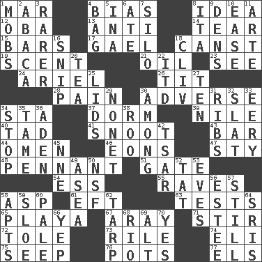 ACROSS 1. Spoil 4. Prejudice 8. The content of cognition 12. Chief or king in Benin or Nigeria 13. Opposed to 14. Rend 15. Taverns 17. Highlander 18. 2nd pers. sing. pres. of can (arch.) 19. Odor 21. Petroleum 23. Observe 24. Satellite of Uranus 26. Teat (slang) 28. Ache 30. Contrary to your interests or welfare 34. R.R. building 37. Dormintory (informal) 39. Mediterranean tributary 40. Small amount or degree 41. Snob 43. Soap unit 44. Sign of things to come 46. Immeasurably long periods of time 47. Filthy place 48. Pre-World Series prize 51. Yard entry 54. Double-curved letter 55. All-night dance parties 58. Cleo's killer 61. Bank Draft (abbr.) 63. Trials 65. Beach, in Buenos Aires 67. Like ___ of sunshine 71. Tumult 72. Lacquered or enameled metalware 73. Cause heat under the collar 74. Biblical high priest 75. Ooze 76. Cooking vessels 77. Raised railways DOWN 1. Crowds into 2. Phillipine bananalike plant 3. More uncommon 4. Container for groceries 5. _ tizzy (2 wds.) 6. Had dinner 7. Grain storage tower 8. Call ___ day 9. Cub Scout units 10. Relaxation 11. Johnson of "Laugh-In" 16. Clip 18. 154 in Roman numerals 20. Afternoon social gathering 22. It would 25. Hats (slang) 27. Nine, plus one 29. Music written for nine 30. Amid 31. Chest bones 32. Narrow board 33. Suggestive of the supernatural 34. Obstruct or block passage 35. Not wild 36. Arabian gulf 38. Friend of Pooh 42. Russian ruler of old 45. Compass dir. 49. Toward the sea 50. Science/research agcy. 52. Make lace 53. Nights before holidays 56. First name in cosmetics 57. Free of sound 58. Tenement units (abbr.) 59. _ gin 60. Diluted with white 62. Canvas cover 64. Indian titles of respect 66. Slangy assent 68. River (Sp.) 69. Keyboard modifier key 70. It is so