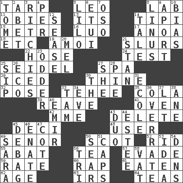 ACROSS 1. Canvas cover 5. Lion 8. Experiment locale 11. Off-Broadway awards 13. ___ a Wonderful Life 14. Native american tent (variation) 15. Distance measurement (Brit.) 16. Nilotic language 17. Small Philippine buffalo 18. And so on (abbr.) 19. Mine, in Marseilles 21. Runs notes together 22. Stockings 24. Trial 25. Beer mug 27. Health resort 29. On the rocks 30. One or ones belonging to thee 32. Airs 33. Giggle 35. Root beer relative 39. Break or tear apart 41. Baking chamber 42. Madame (abbr.) 43. Keyboard key 45. Tenth: prefix 48. One who makes use of a thing 49. Sir (Sp.) 50. Native of Scotland 52. To free from 55. Blind as ____ 56. Afternoon social gathering 57. Dodge 59. Pace 60. Reproach for some lapse or misdeed 61. Ingested 62. Mature 63. Big collection agency 64. Beverages made from leaves DOWN 1. Heavy book 2. Collude with 3. Actors Guy, Robert Welles, and Clint 4. For each 5. _ and Stitch 6. Needle holder 7. Bear (Spanish) 8. "_ and Lucy" (Charlie Brown theme song) 9. To the left, to Queeg 10. Prejudice 12. Gospel singer Marvin 14. Falsehood 20. Cartoonist voice _ Blanc 21. Comedian Laurel of Laurel & Hardy 23. More peculiar 25. Small drink 26. Environmental prefix 27. A female animal or person 28. Sliced dessert 30. Definite Article 31. Learning spot: Fr. 33. Scottish cap 34. Night before a holiday 36. Make much ado about nothing 37. Allow 38. A saturated hydrocarbon 40. Independent ruler or chieftain 43. Superhero pair 44. First name in cosmetics 45. Debunk (Brit. slang) 46. Related on the mother's side 47. ____ d'Azur (French Riviera) 49. "Two Mules for Sister ____" 50. Wither 51. Balmoral and tarboosh 53. The main thing one is thinking about 54. Habitations of wild animals 56. Three (prefix) 58. Large container