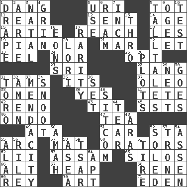 ACROSS 1. Mild oath, euphamism for damn 5. RI univ. 8. Small child 11. Buttocks 12. Posted 14. Ripen 15. Nick name for Arthur 17. Arrive at 18. French article 19. Player piano 21. Make imperfect 22. Allow 23. Snakelike fish 24. Not either 25. Choose 27. Indian title of respect (Mr.) 28. Austrian-born American filmmaker Fritz 31. Scottish caps 35. It is 37. Butter sub 38. Sign of something about to happen 39. It is so 41. Wig 42. Former U.S. Attorney General Janet 43. Teat (slang) 45. Fast planes 46. Southwest Nigerian state 47. Beverage made from leaves 49. "One Day ___ Time" 51. Automobile 52. R.R. building 55. Curve 57. Floor protector 60. Speakers 62. Cards in a Roman deck? 63. Indian state 65. Grain storage towers 66. The first octave above the treble staff 67. Pile 68. French philosopher Descartes 69. Marina Del _, California 70. Tate display 71. Genesis locale DOWN 1. Window treatment 2. Nest on high 3. Brizilian seaport 4. Amused look 5. Purpose 6. 480, 500 or 516 sheets of paper 7. South American Indian 8. Baron Munchausen's specialties 9. Double curve, resembling the letter S 10. Trial 13. Through, poetically 16. Immeasurably long periods of time 17. Noteworthy scarcity 20. Australian parrot (variant) 26. Small pieces of grounds 29. Remaining after all deductions 30. Travels 31. "Corrida" creature 32. So be it 33. Ananias' fault 34. Snout, nose 36. Arrange properly for use 40. "Cheers" or "Ellen" 44. Lacerate 48. Caspian sea tributary 50. Housemaid 52. Having a sole or soles 53. Heavy duty weighing machine 54. NE Netherlands city 55. Having or resembling wings 56. Cause heat under the collar 58. At sea 59. Russian ruler of old 61. Become fatigued 64. Fitting