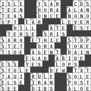 ACROSS 1. Small island 5. Russian ruler of old 9. Music discs 12. Adolescent 13. Israeli folk dance 14. Actor Alda or Thicke 15. Beverages made from leaves 16. Single time 17. Words to Nanette 18. Elect 19. Hearing organ 21. Crowbar 22. Land elevation 24. Had dinner 26. Eastern Standard Time (abbr.) 27. Laconic 28. Indian titles of respect 29. "Two Mules for Sister ____" 30. Value system 32. Discontinue 36. Proofreading order 37. Mouth or opening 38. Casino tip 39. Event that recurs at intervals 40. Rep 42. Water falling in drops from the sky 43. Mild oath 44. Remain 46. Double-curved letter 49. It is so 50. Chops off 51. Took without asking 53. Morning condensation 54. Make lace 57. "Change" in Tahitian 58. Governing power 61. Not divided or shared with others 62. Otherwise 63. SW Asia republic 64. Mail 65. Perceive with the eye 66. Claim 67. Medicinal plant DOWN 1. "Tell ____ the Marines!" 2. Ooze 3. Resembling or made to resemble leather 4. Followers of ems 5. Son of Odin 6. Male offspring 7. Curve 8. Actress Charlotte 9. Garlic unit 10. Natives or inhabitants of Denmark 11. Derisive sound 14. A saturated hydrocarbon 19. Raised railways 20. Toward shelter 21. French article 23. Feeling or showing extreme anger 24. Believer in; advocate of (suffix) 25. Nervous spasm 27. Jacques of French films 28. Tear up 29. Fast jet (abbr.) 31. Ancient Roman robes 32. Long narrow piece of something 33. Inedible or poisonous agaric 34. Migrant worker of the '30s 35. Writing instrument 40. Grow older 41. Lie 43. Sight organ 45. Ribbon knot 46. _____ Park, CO 47. Lacking originality or spontaneity 48. Boozer 52. Falsehood 53. Habitations of wild animals 55. In addition 56. Wig 58. To free from 59. RI univ. 60. Experiment locale 61. Health resort