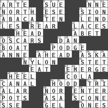 ACROSS 1. Johnson of "Laugh-In" 5. Institute legal proceedings 8. Compass dir. 11. Compass direction 13. Compass dir. 14. The Jewish people; Israel 15. Phillipine bananalike plant 16. Nine, plus one 17. Grant temporary use of 18. French article 19. Rump 21. Shoestrings 22. Froth on beer 24. Collude with 25. Motion picture awards 27. One of the 12 tribes of Israel 29. Water vessel 30. Puddle 32. Singer Murray 33. Having the leading position 35. "____ silly question..." 39. High-strength synthetic material 41. Proofreading order 42. Erode 43. Develop 45. The bottom of a shoe or boot 48. Root beer relative 49. Lessep's creation 50. Parka part 52. Three (prefix) 55. Having or resembling wings 56. Not either 57. Keyboard key 59. Cooking vessels 60. White ___ sheet 61. Biscuitlike quick bread 62. Compass dir. 63. Set 64. Singles DOWN 1. Of or related to the anus 2. Loose flowing garment 3. File 13 4. And so on (abbr.) 5. Bristle 6. One who makes use of a thing 7. Car or cant ending 8. Sibling's daughter 9. Music written for nine 10. Extremities 12. Ethiopian city, capital of Harari 14. Thick slice 20. Begley and Asner 21. Long (Scottish) 23. Ingested 25. Chief or king in Benin or Nigeria 26. Manchild 27. ___ good deed 28. Increase 30. Animal enclosure 31. Artist's stand 33. Insect wing 34. Being at a high temperature 36. Ski resort town in Vermont 37. Barrel 38. Had dinner 40. Shout 43. Environmental prefix 44. Methods 45. Radiant circles of light 46. Maternal 47. Hearing organs 49. Balmoral and tarboosh 50. Stockings 51. Relating to the mouth 53. French philosopher Descartes 54. Angers 56. Tired old horse 58. Non-commissioned officer (abbr.)