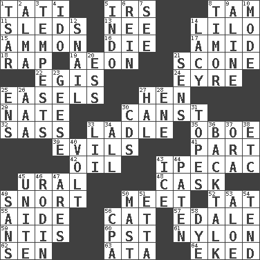 ACROSS 1. Jacques of French films 5. Big collection agency 8. Scottish cap 11. Bobsleighs 13. Born 14. _ and Stitch 15. ID or VA city 16. Expire 17. Among 18. Reproach for some lapse or misdeed 19. A really long time 21. Biscuitlike quick bread 22. The front part of a cuirass 24. Jane of fiction 25. Artist's stands 27. Layer 29. Nathan's nickname 30. 2nd pers. sing. pres. of can (arch.) 32. Backtalk 33. Dipping utensil 35. Mitch Miller's instrument 39. Vices 41. Role in a play 42. Lubricate 43. Medicinal drug used to evoke vomiting 45. Mountain range 48. Keg 49. Derisive sound 50. Rendezvous 52. Make lace 55. Helper 56. Feline 57. Peak District village in England 59. Nuclear Threat Initiatives 60. Pacific Standard Time (abbr.) 61. Thermoplastic polyamide 62. Elected rep. 63. "One Day ___ Time" 64. Supplemented with great effort DOWN 1. Russian ruler of old 2. _ mater 3. Storms 4. Wedding promise 5. _ china 6. It's straight from the horse's mouth 7. Perceive with the eye 8. Southeast Indonesia island 9. Place in a line 10. Method 12. Slow-paced one 14. Made of lace 20. Curvy letter 21. Elected reps. 23. Honkers 25. Followers of ems 26. American Automobile Association (abbr.) 27. Actor Linden 28. Compass dir. 30. Music discs 31. Drinks excessively 33. Cards in a Roman deck? 34. 100% 36. Sass 37. Mouth or opening 38. And so on (abbr.) 40. Electrical Unit 43. Frozen water 44. Eucharist need 45. Join together 46. "The Thinker" sculptor 47. Ancient Greek god of war 49. Without 50. Vertical spar for supporting sails 51. Singer James 53. _ vera 54. Be inclined (to) 56. Numbers guy (abbr.) 58. Color