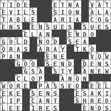 ACROSS 1. Periodic rise and fall of the sea level 5. Inactive volcano in Sicily 9. Large container 12. Vices 14. The Jewish people; Israel 15. In the manner of 16. Eating place 17. Roberta Peters solo 18. Gear tooth 19. Followers of ems 20. Takes place subsequently 23. Institutes legal proceedings 24. Liveliness 25. Inside; within (prefix) 27. Gilded 30. Allow head to fall sleepily 32. Ocean 33. Mouths or openings 34. Like ___ of sunshine 36. Ring climax 38. Baking dish 39. Compass dir. 40. Solemn pledge 43. Thick or sticky substance 46. Transmit 48. Lairs 49. Girls' org. (abbr.) 51. Filthy place 52. Afresh 53. Hoof sound 54. Soon (poet.) 56. Had on 58. Went by 61. Snakelike fish 64. Supplement with great effort 65. Elected reps. 66. 1973 Nobel Price Winner (Physics) Leo 68. Mouth edge 69. Patter 70. Fragment 71. Area sheltered from the wind 72. Angers 73. Conclusions DOWN 1. False hair 2. _ the terrible 3. Rights 4. Pipe bend 5. He sold his birthright 6. Become fatigued 7. Annoying sounds 8. Santa ___, CA 9. In a vacuum (with "in") 10. Medicinal plant 11. Labels 13. Stitch closed the eyes of (a falcon) 21. Grandmother 22. Sounds asleep 23. Neighbor of Neb. 24. Begley and Asner 26. Fish or hair follower 27. Republican Party 28. Mouth or opening 29. Austrian-born American filmmaker Fritz 31. Natives or inhabitants of Denmark 35. Gossips 37. Baking chamber 41. Single 42. Compass dir. 44. Stare at amorously 45. Bear (Spanish) 47. Centimeter-gram-second unit of force 48. One of the 12 tribes of Israel 50. Become visible 53. Streamer paper 55. Lyric poems 56. Not ill 57. Migrant worker of the '30s 59. Singer Murray 60. Fast planes 61. Merit 62. Made supply last 63. Hats (slang) 65. _-fi 67. A female animal or person